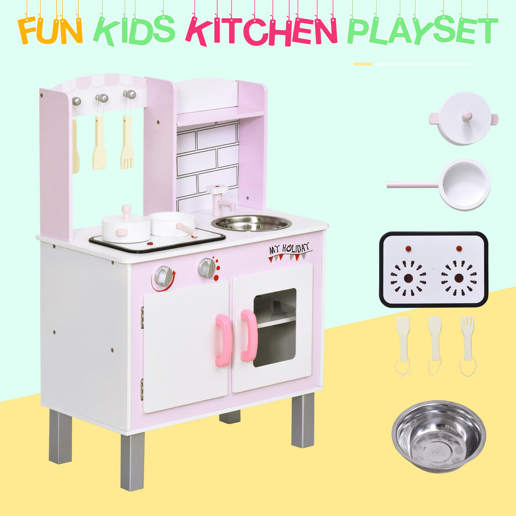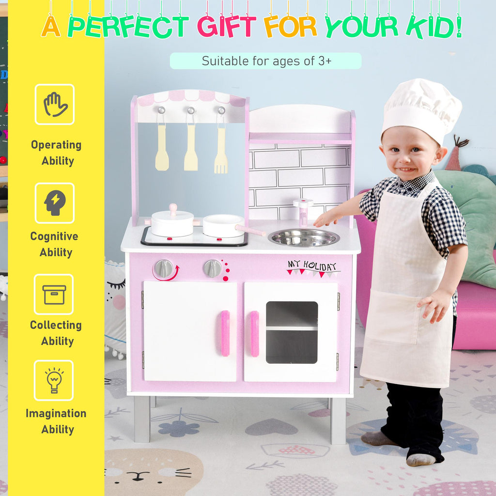Cucina Giocattolo per Bambini 55x30x80 cm in Pino e MDF con Accessori Rosa