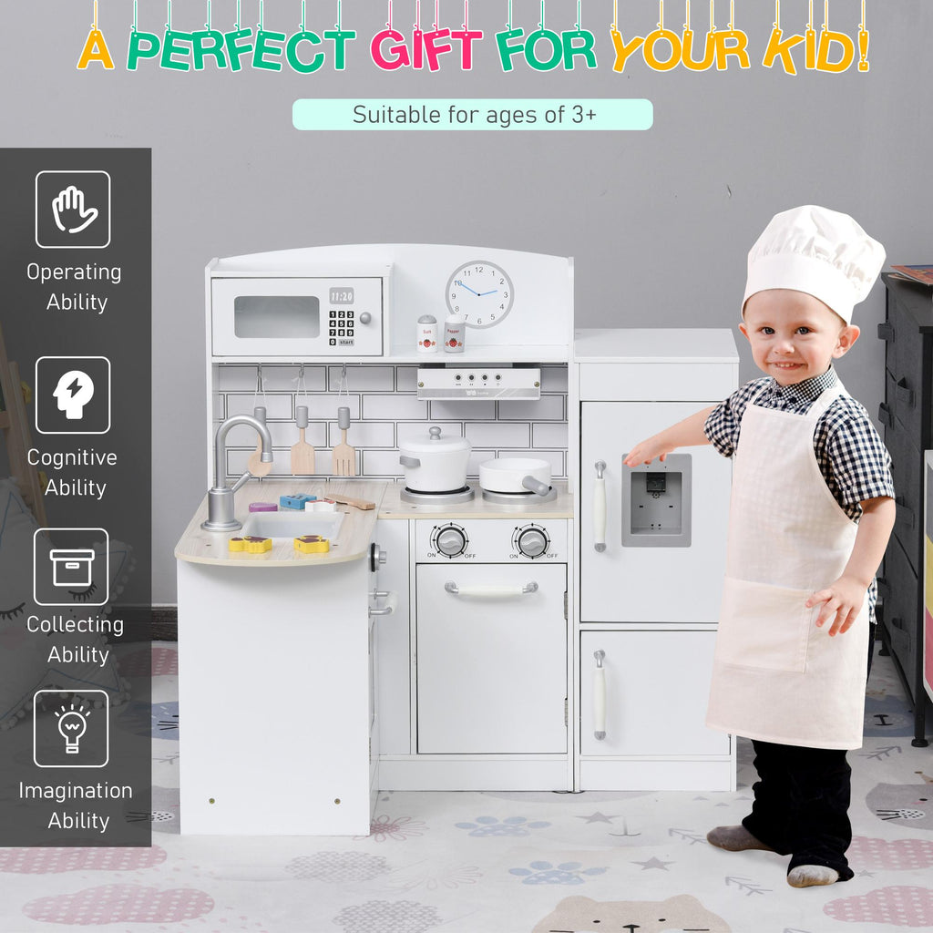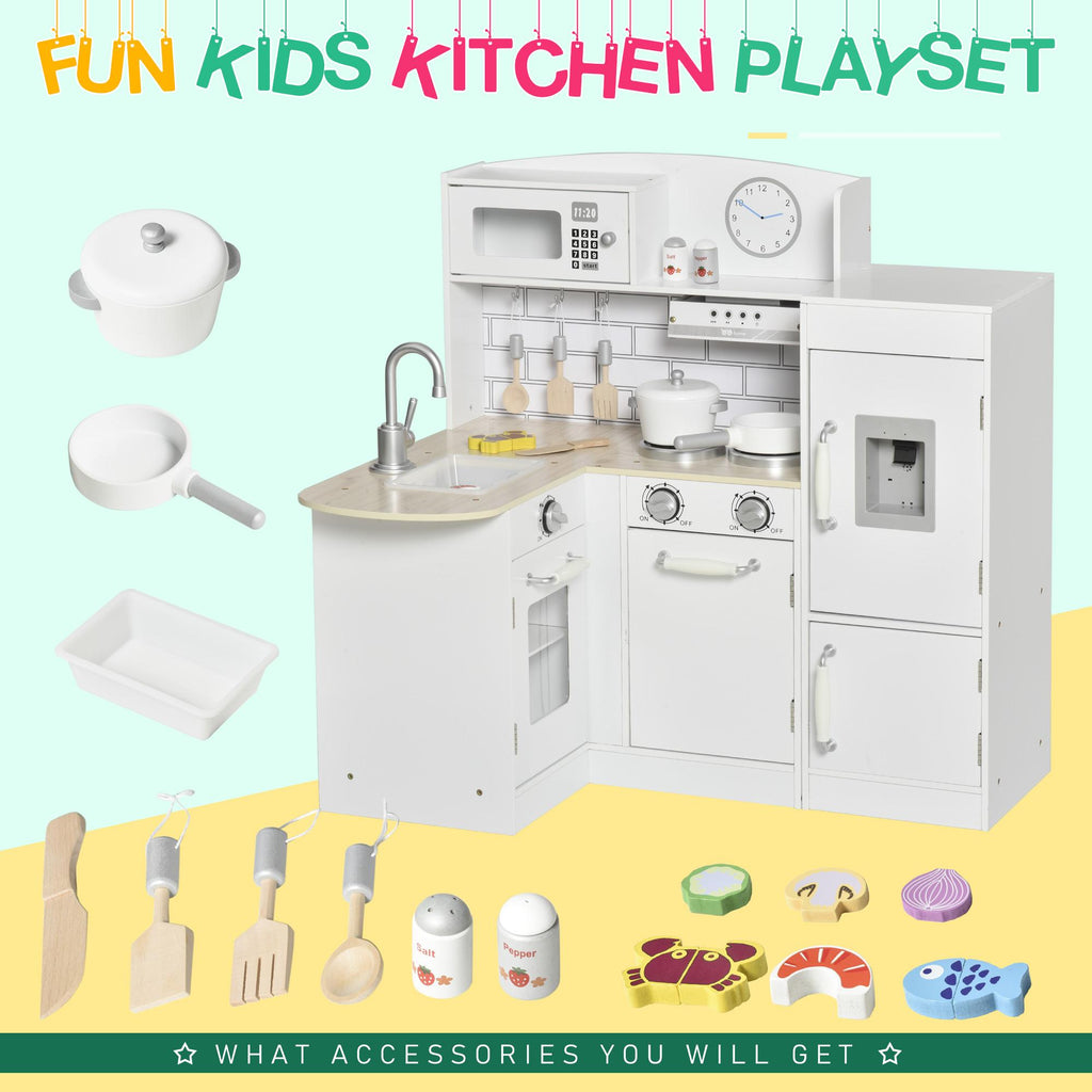- SET COMPLETO: Questa cucina giocattolo angolare è dotata di un set completo di accessori, che include: 1 coltello, 1 forchetta, 2 cucchiai, 1 padella, 1 pentola, contenitori sale e pepe, 1 granchio, 1 cipolla, 1 fungo, 1 gamberetto, 1 pesce, 1 broccolo. Il blocco con frigorifero può essere staccato e posizionato dove preferisci.