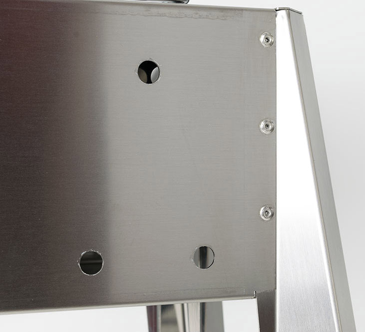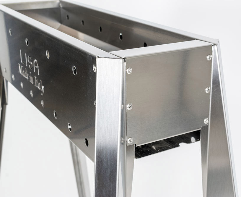 Il doppio fondo raccoglie la cenere durante lutilizzo e ne facilita leliminazione al termine della cottura. Profilo antitaglio: tutte le estremità sono lisciate, ripiegate e levigate per garantire la massima sicurezza. Il montaggio delle gambe è semplice e veloce, con il sistema di innesto a baionetta che non richiede attrezzi.
