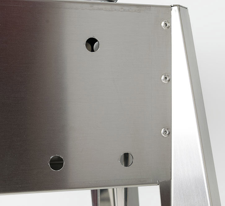 Profilo antitaglio: tutte le estremità sono lisciate, ripiegate e levigate per garantire la massima sicurezza. Il montaggio delle gambe è semplice e veloce, con il sistema di innesto a baionetta che non richiede attrezzi. Facilmente smontabile, si può riporre comodamente in spazi ridotti quando non utilizzato. Senza gambe, il cuocispiedini può essere utilizzato su un piano di appoggio grazie ai piedini rialzati incorporati nel corpo centrale.