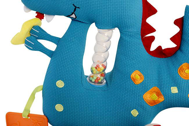 Dino rappresenta la prima introduzione di un bambino alle meravigliose attività sonore durante il gioco! Il sonaglio a cascata nella sua pancia, la foglia da tirare per sentire una sensazione di vibrazione, i suoni scricchiolanti, i sonagli ed il massaggiagengive contribuiscono allo sviluppo dell'apprendimento attraverso il gioco e un divertimento senza fine.