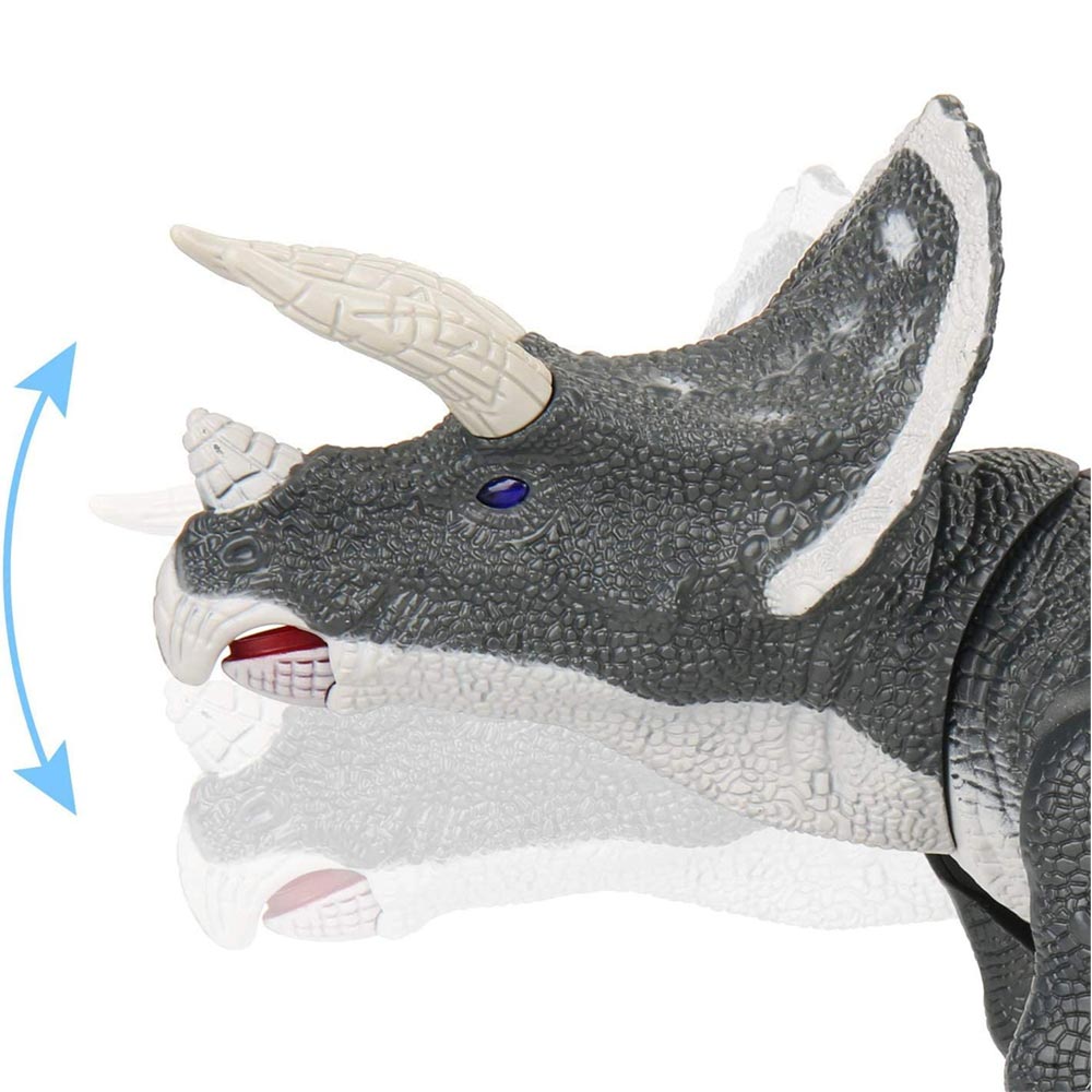 Curato in ogni dettaglio con finiture super realistiche questo ferocissimo triceratopo robot è in grado di camminare, ruggire e scuotere la testa.