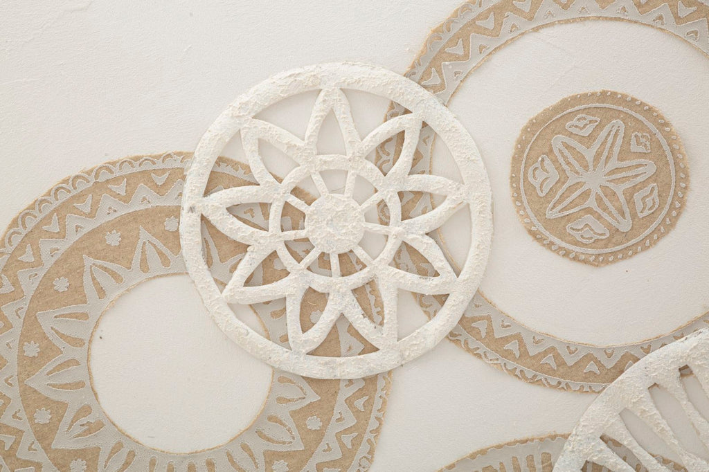 Questo dipinto su tela è un'opera completa e pronta per essere appesa. Il suo telaio è arricchito da decorazioni in rilievo che aggiungono un tocco di eleganza. I motivi geometrici presenti nella tela sono caratterizzati da toni caldi e avvolgenti, creando un'atmosfera accogliente e rilassante. Le decorazioni in rilievo conferiscono profondità al dipinto, rendendolo un vero punto focale per qualsiasi ambiente.