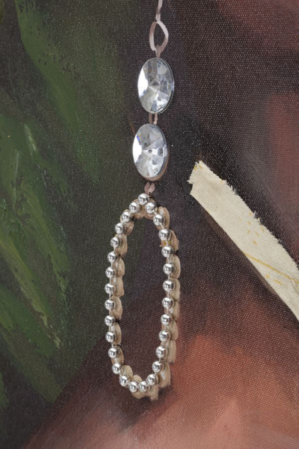 Questo dipinto su tela, incorniciato con un telaio in legno pregiato, cattura l'immagine di una donna espressiva e sognante. Le applicazioni in tessuto, graziosamente disposte sulla tela, conferiscono un tocco di eleganza e raffinatezza alla raffigurazione. La donna sembra emanare un'aura di mistero e grazia, i suoi occhi penetranti e il sorriso appena accennato lasciano intravedere una profonda interiorità. L'opera è un equilibrio armonioso tra la reale bellezza del soggetto e l'interpretazione artistica che ne trasmette un senso di fascino etereo.