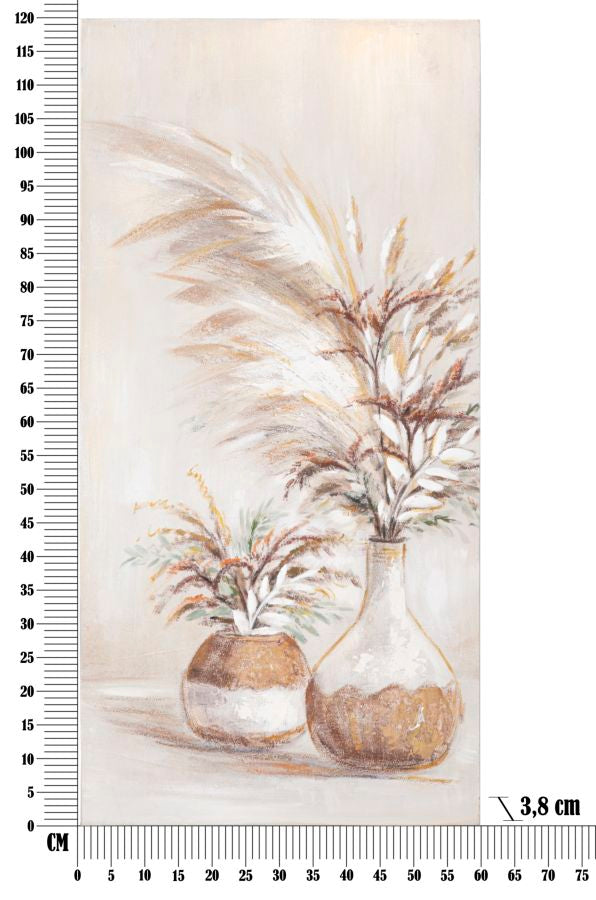 Questo dipinto su tela è un'opera completa con un telaio in legno. Rappresenta dei vasi di fiori che emanano tonalità calde e avvolgenti. I colori delicati e sfumati conferiscono alla scena un'atmosfera suggestiva e rilassante. L'opera trasmette una sensazione di serenità e bellezza naturale.