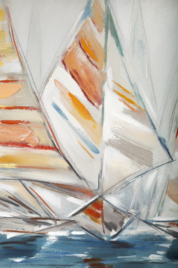Questo dipinto su tela, con un telaio in legno, cattura l'immagine di barche a vela naviganti sul mare. La sua rappresentazione impressionista esalta il movimento e la bellezza del paesaggio marino. I colori vivaci utilizzati donano energia e vitalità all'intera opera, che può trasformare qualsiasi parete in un punto focale vivace e affascinante.