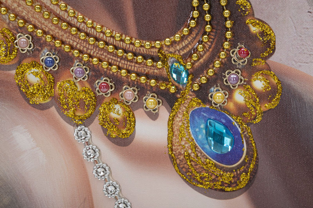 Questo dipinto su tela, incorniciato da un telaio in legno, presenta un ritratto seducente di una donna. Il suo volto è magistralmente rappresentato, con lineamenti delicati e un'espressione di mistero. Il copricapo che indossa è adornato con eleganti applicazioni in tessuto, che aggiungono un tocco di raffinatezza e sofisticatezza all'immagine. L'intera composizione trasmette un senso di bellezza, grazia e fascino senza tempo.
