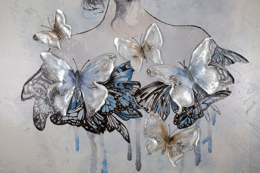 - Dipinto rappresenta una figura femminile di spalle con un vestito di farfalle in rilievo
