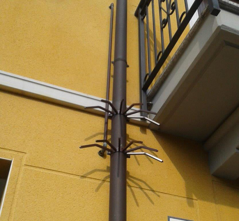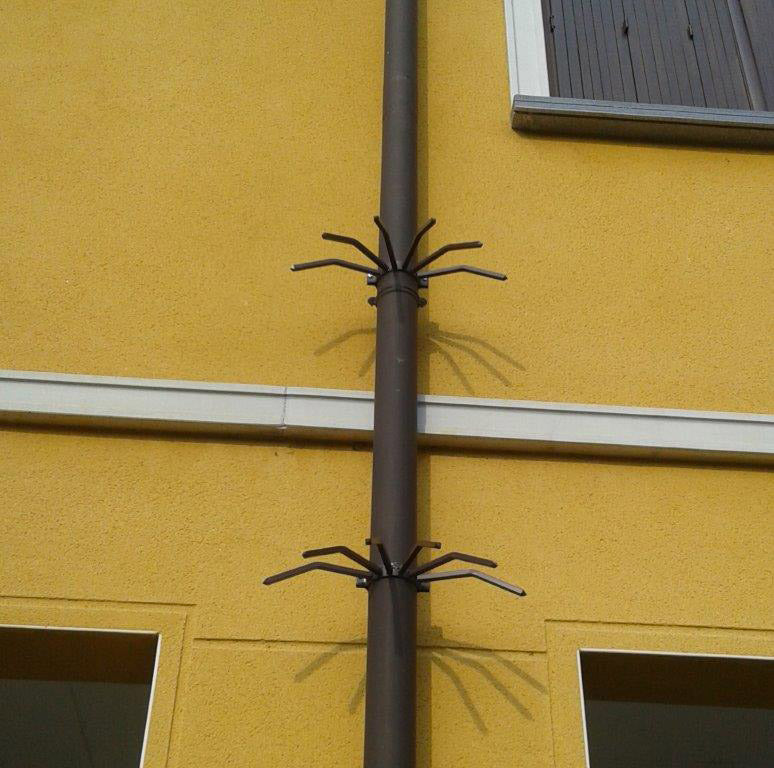 Questa linea di dissuasori, per tubature esterne tipo pluviali, condotte del gas e similari, è realizzato in acciaio.Le punte servono ad allontanare ladri che intendono salire nelle abitazioni usando come appigli le tubazioni esterne. Si installa a pluviale tramite il collare in dotazione, con viti e dadi, rendendo la posa in opera semplicissima, evitando fori a muro a pluviale che potrebbero causare infiltrazioni. Inoltre, in caso di posa in opera inadeguata, lo si può riposizionare in altra posizione ritenuta più idonea. La gamma copre qualsiasi situazione, sia come formato sia come finitura, inoltre sono presenti anche dei modelli a copertura di quei punti particolari, tipo i Pluviali posti tra muri ad angolo di 90° gradi.