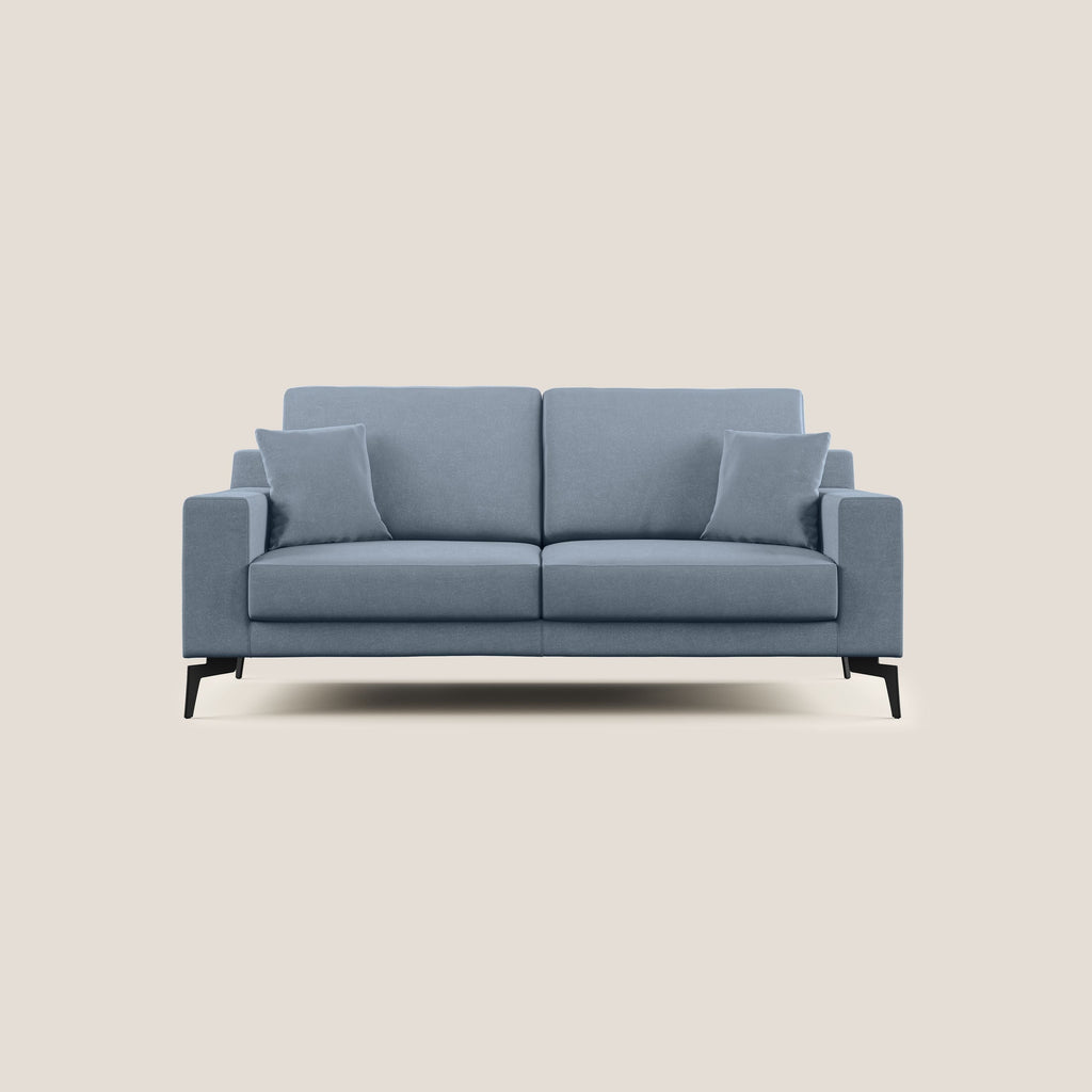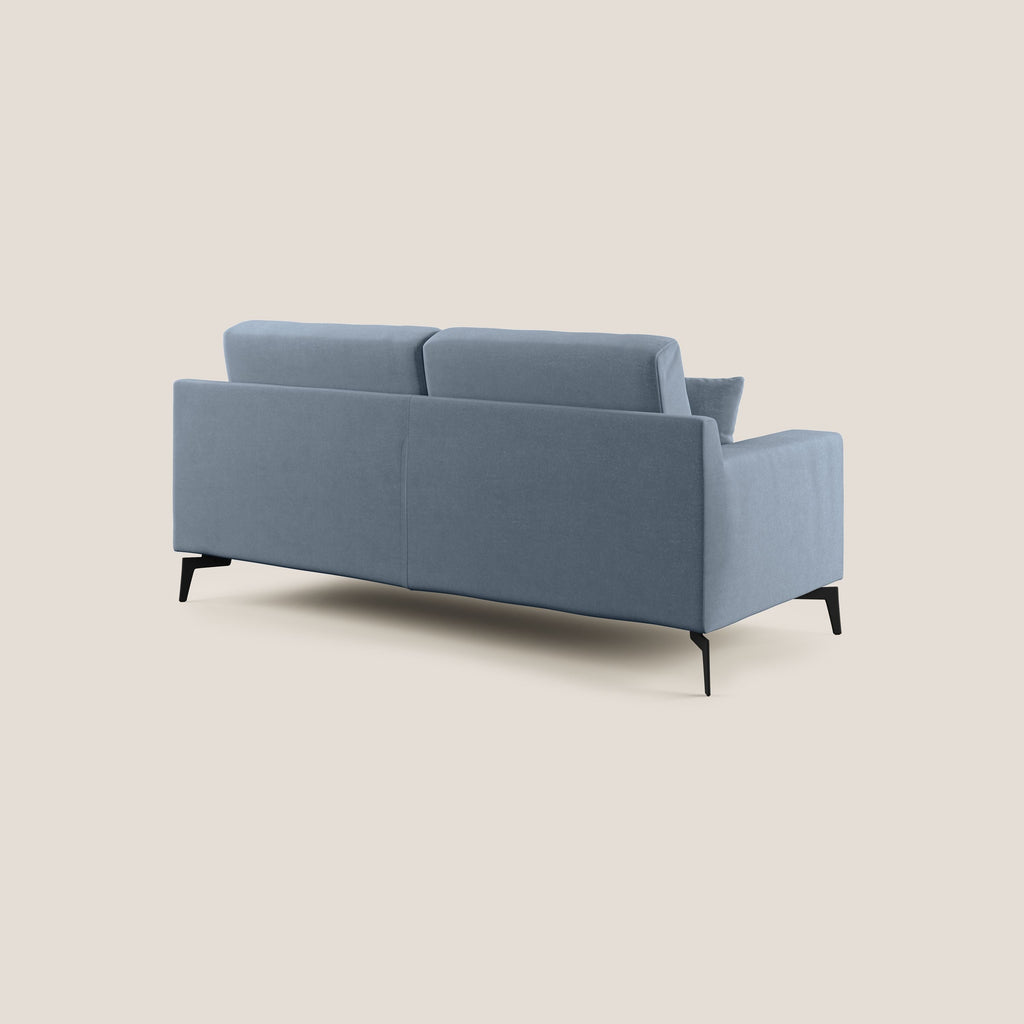 Il divano lineare è realizzato in microfibra tecnica smacchiabile ed impermeabile, con piedini in acciaio antracite alti 17 cm che conferiscono eleganza e equilibrio formale. Disponibile in diversi colori e misure, è un prodotto totalmente italiano caratterizzato da una raffinata manifattura artigianale e dettagli "haute couture". I materiali selezionati con attenzione, come la microfibra tecnica ad alto spessore e di facile pulizia, insieme alla doppia lavorazione del rivestimento, ne fanno un elemento prezioso per l'arredamento della zona living. La sfoderabilità totale del divano e l'alta densità dei materiali della seduta e dello schienale ne esaltano le caratteristiche e la qualità.