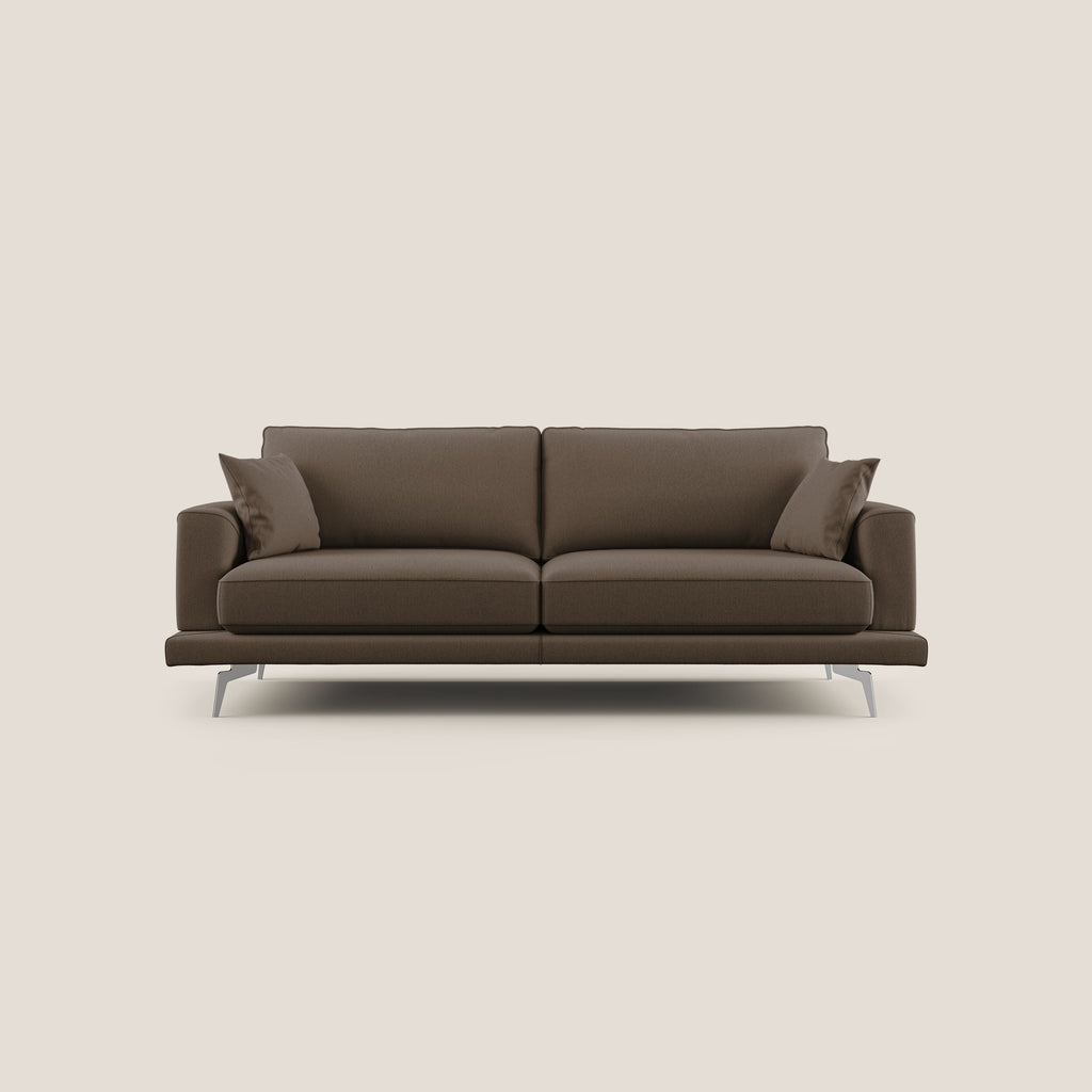 Il divano è un'opera unica nel suo design, con volumi leggeri che vengono esaltati dalla sua struttura in abete e dai cuscini dello schienale in piuma d'oca. Ogni dettaglio di questo divano è rifinito con cura, e questo si riflette nella sua qualità. Disponibile in un'ampia scelta di colori e misure, il divano si adatta a ogni ambiente.Questo divano offre anche praticità e comfort, essendo completamente sfoderabile e dotato di una doppia lavorazione sartoriale che ne evidenzia l'eccellenza dell'artigianato italiano. Il bracciolo con profilo a onda aggiunge un tocco di dolcezza alla linea moderna del salotto, mentre i piedini alti 18 cm in acciaio cromato conferiscono leggerezza al divano e facilitano la sua pulizia. In sintesi, il divano unisce estetica e funzionalità in modo impeccabile.