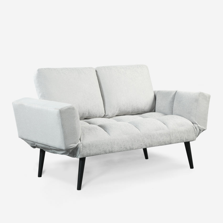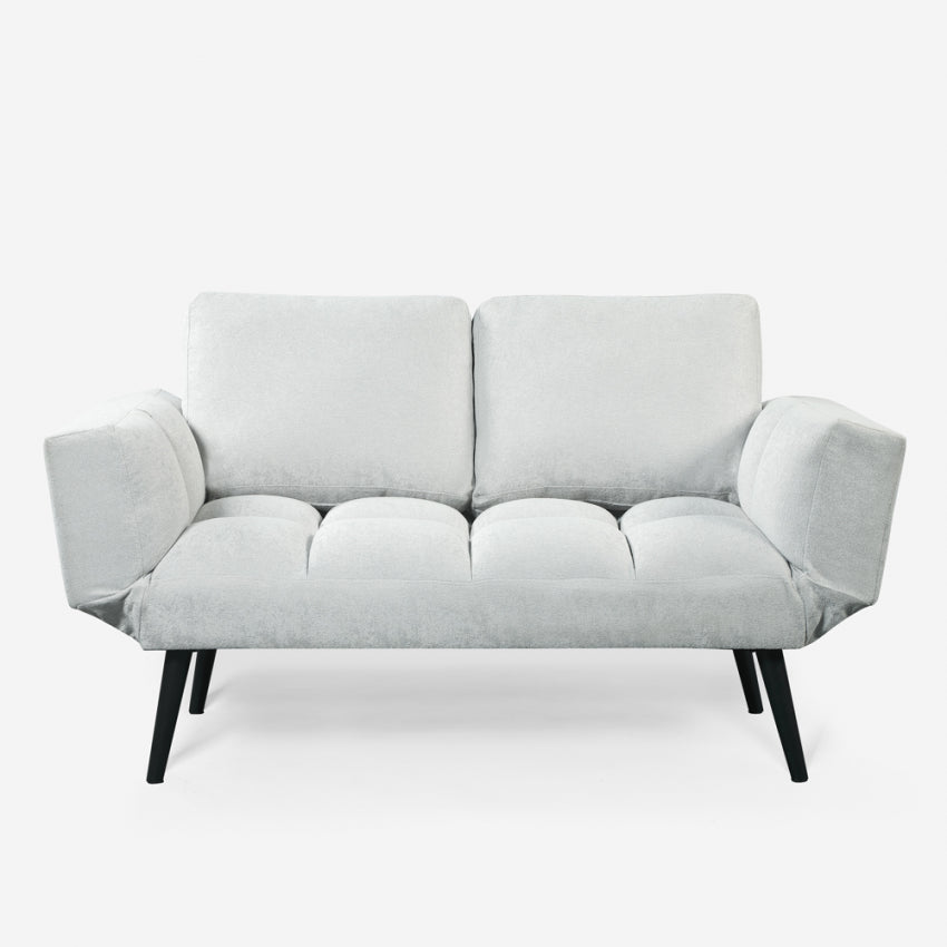 Sorretto da quattro piedini in metallo, garanzia di notevole stabilità, il divano presenta una seduta ergonomica con un'imbottitura in schiuma maggiorata: questo dettaglio, insieme al morbido rivestimento in tessuto, garantisce un comfort ottimale e duraturo, aspetto da non sottovalutare nella scelta di un complemento d'arredo destinato magari a ospitare amici o parenti durante serate in compagnia. Il robusto telaio in legno è in grado di sostenere, senza ricevere particolari sollecitazioni, il peso degli occupanti e contribuisce ad aumentare la solidità complessiva del divano. Per aumentare ulteriormente il tasso di comodità, è possibile abbattere lateralmente i braccioli, in modo tale da distendersi completamente.