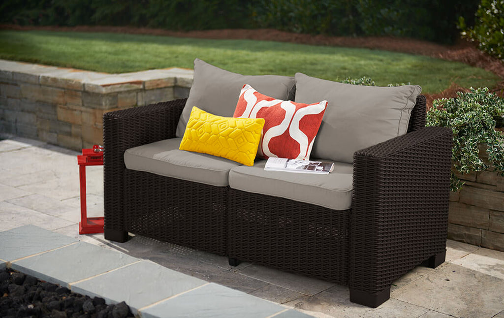 Rilassati nel comfort del divano California. Realizzato con resina durevole e resistente agli agenti atmosferici che riproduce l'intreccio arrotondato del rattan. Non necessita di manutenzione.