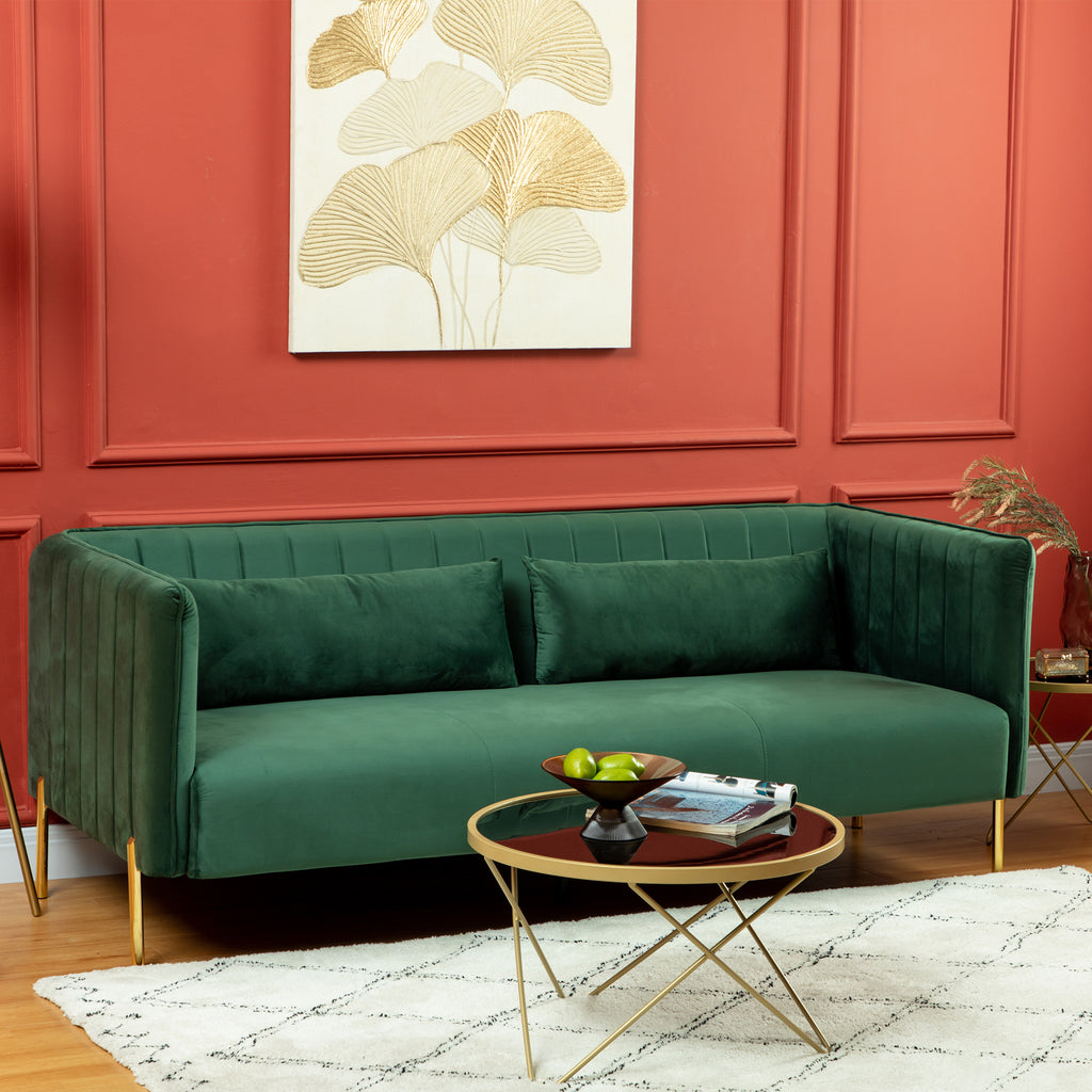 - ARREDO ELEGANTE: Porta un tocco di eleganza all'interno della tua casa con questo divano verde, grazie al raffinato tessuto effetto velluto e le gambe in acciaio dorato. Un complemento classico in grado di adattarsi a molti stili