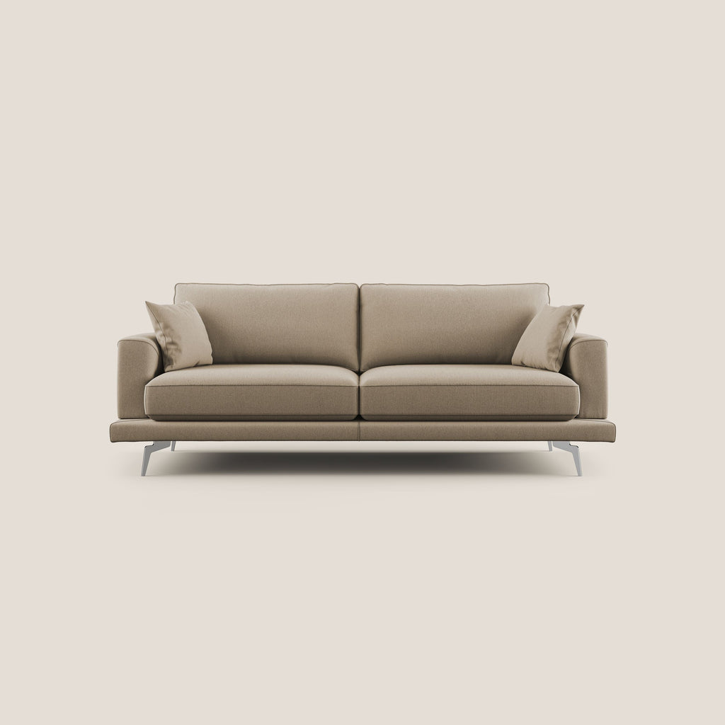 Il divano è un pezzo dal design unico e raffinato, caratterizzato da volumi leggeri che mettono in risalto la sua struttura in abete e i cuscini dello schienale in vera piuma d'oca. Ogni dettaglio è curato con attenzione, rendendo il divano un vero capolavoro artigianale italiano. Disponibile in 12 diverse tonalità e misure, il divano è completamente sfoderabile e presenta una doppia lavorazione sartoriale che ne esalta la qualità della manifattura. Il bracciolo con profilo a onda addolcisce la linea moderna del salotto, mentre i piedini alti in acciaio cromato conferiscono una sensazione di leggerezza e facilitano la pulizia.