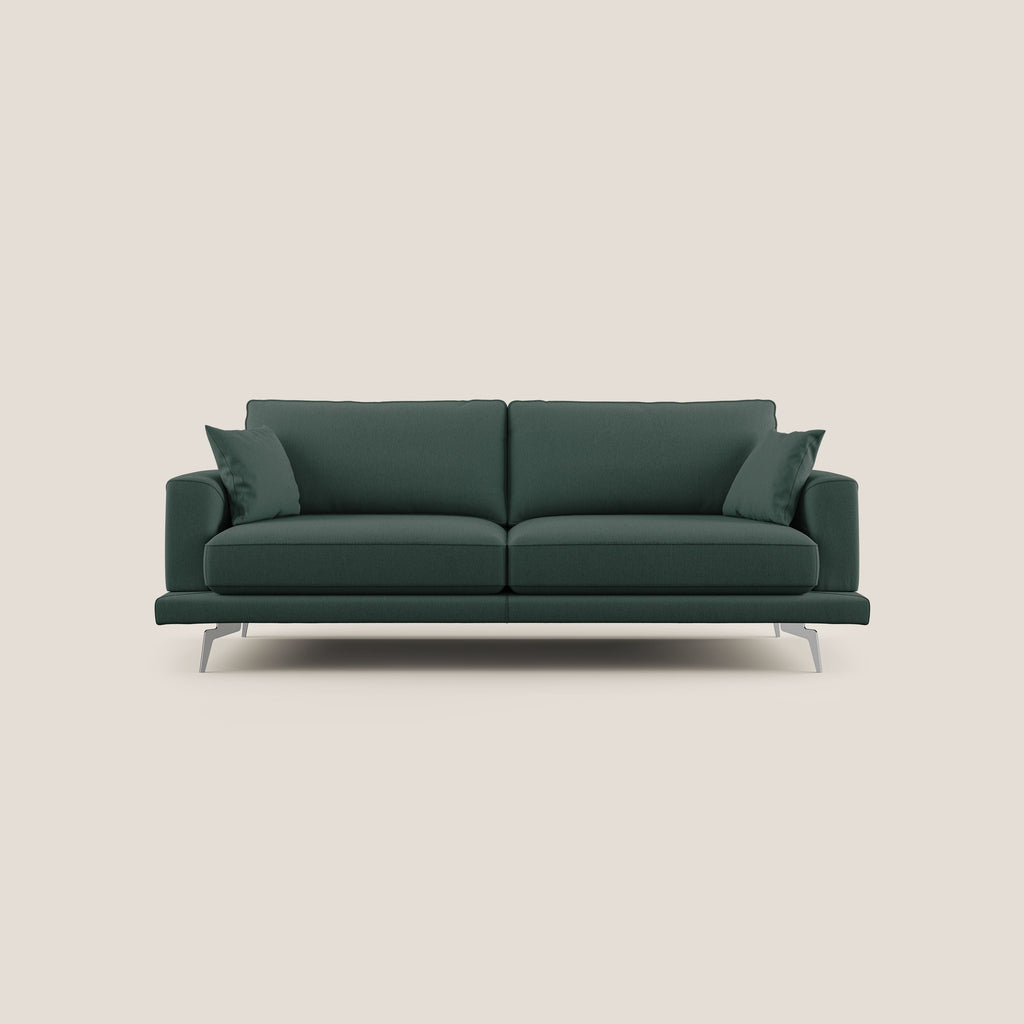 Il divano è un pezzo dal design unico e raffinato, caratterizzato da volumi leggeri che mettono in risalto la sua struttura in abete e i cuscini dello schienale in vera piuma d'oca. Ogni dettaglio è curato con attenzione, rendendo il divano un vero capolavoro artigianale italiano. Disponibile in 12 diverse tonalità e misure, il divano è completamente sfoderabile e presenta una doppia lavorazione sartoriale che ne esalta la qualità della manifattura. Il bracciolo con profilo a onda addolcisce la linea moderna del salotto, mentre i piedini alti in acciaio cromato conferiscono una sensazione di leggerezza e facilitano la pulizia.