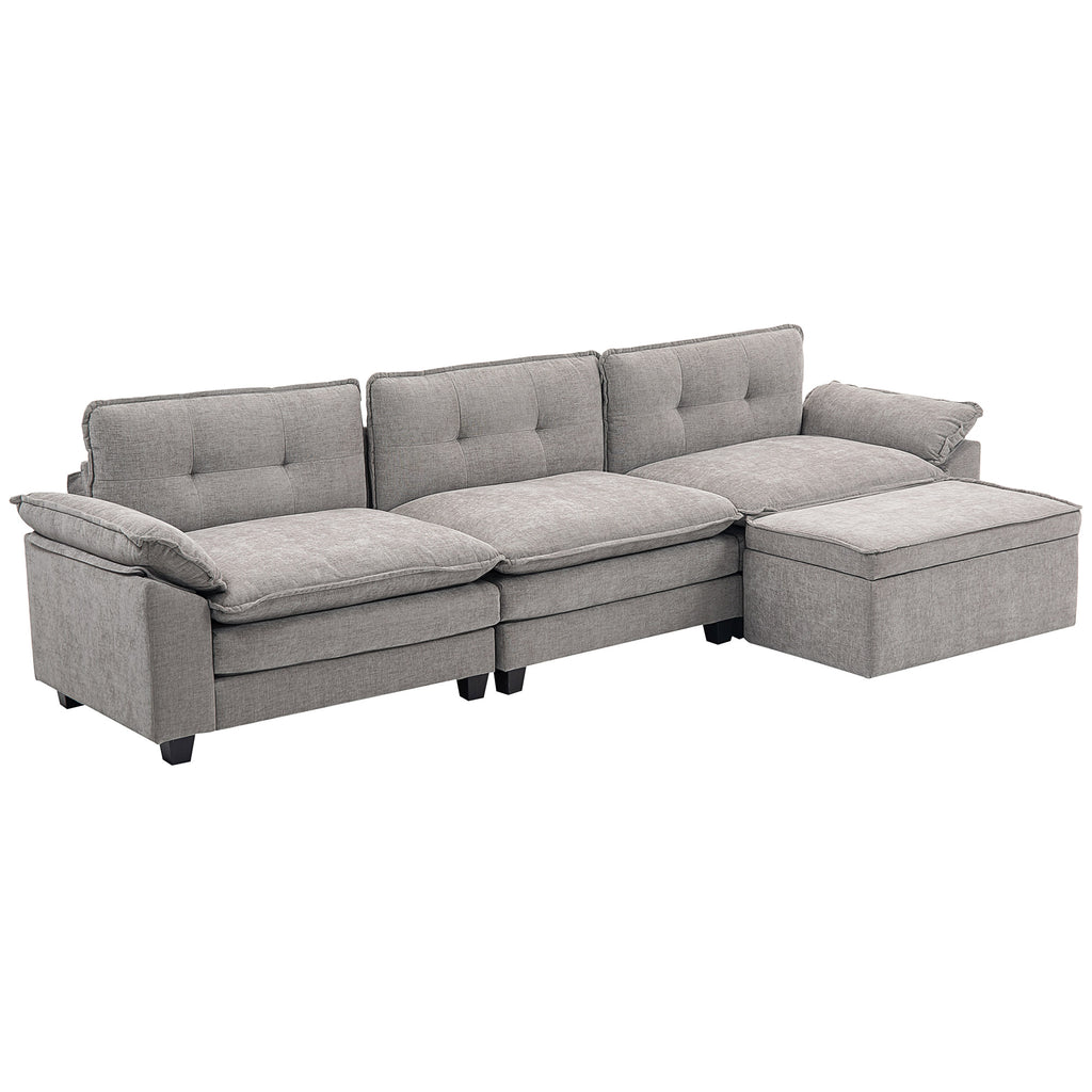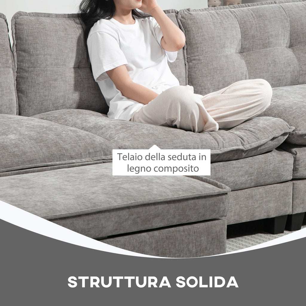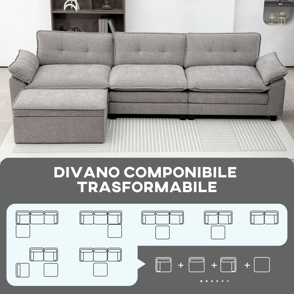 Divano 3 Posti Angolare con Chaise Longue e Pouf Contenitore Rivestimento in Ciniglia Grigio