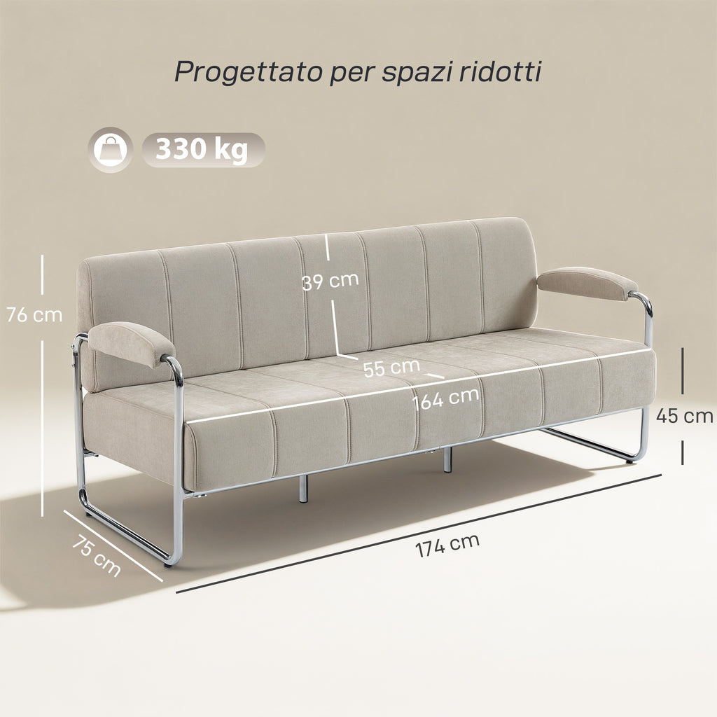 Divano 3 Posti Moderno 174x75x76 cm Rivestito in Ciniglia Struttura in Acciaio Beige