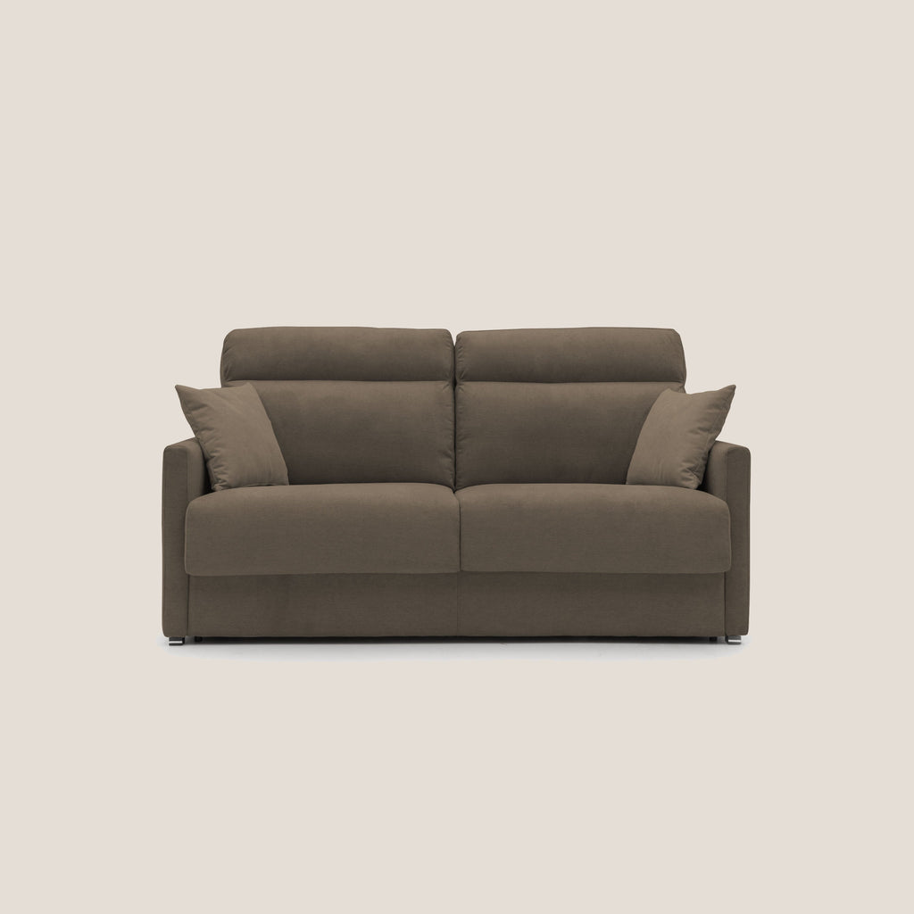 Il divano letto è caratterizzato da un alto schienale imbottito con morbido fiocco, che assicura un comfort elevato e permette di appoggiare comodamente la testa. Realizzato in tessuto impermeabile, è disponibile nelle versioni 3 posti e 2 posti, con piedini in legno wengè e profilo cromato. Il divano si adatta a diverse esigenze di spazio e design, con 12 opzioni di colore disponibili. 100% made in Italy, il divano offre un'ampia e avvolgente seduta, garantendo il massimo del comfort in ogni situazione, ideale per rilassarsi durante il giorno o trascorrere serate piacevoli con gli amici. La seduta del divano è comoda grazie alla doppia densità, offrendo il giusto sostegno al corpo, mentre lo schienale in fiocchi di fibre aggiunge morbidezza e avvolgenza per una sensazione di comfort unica.