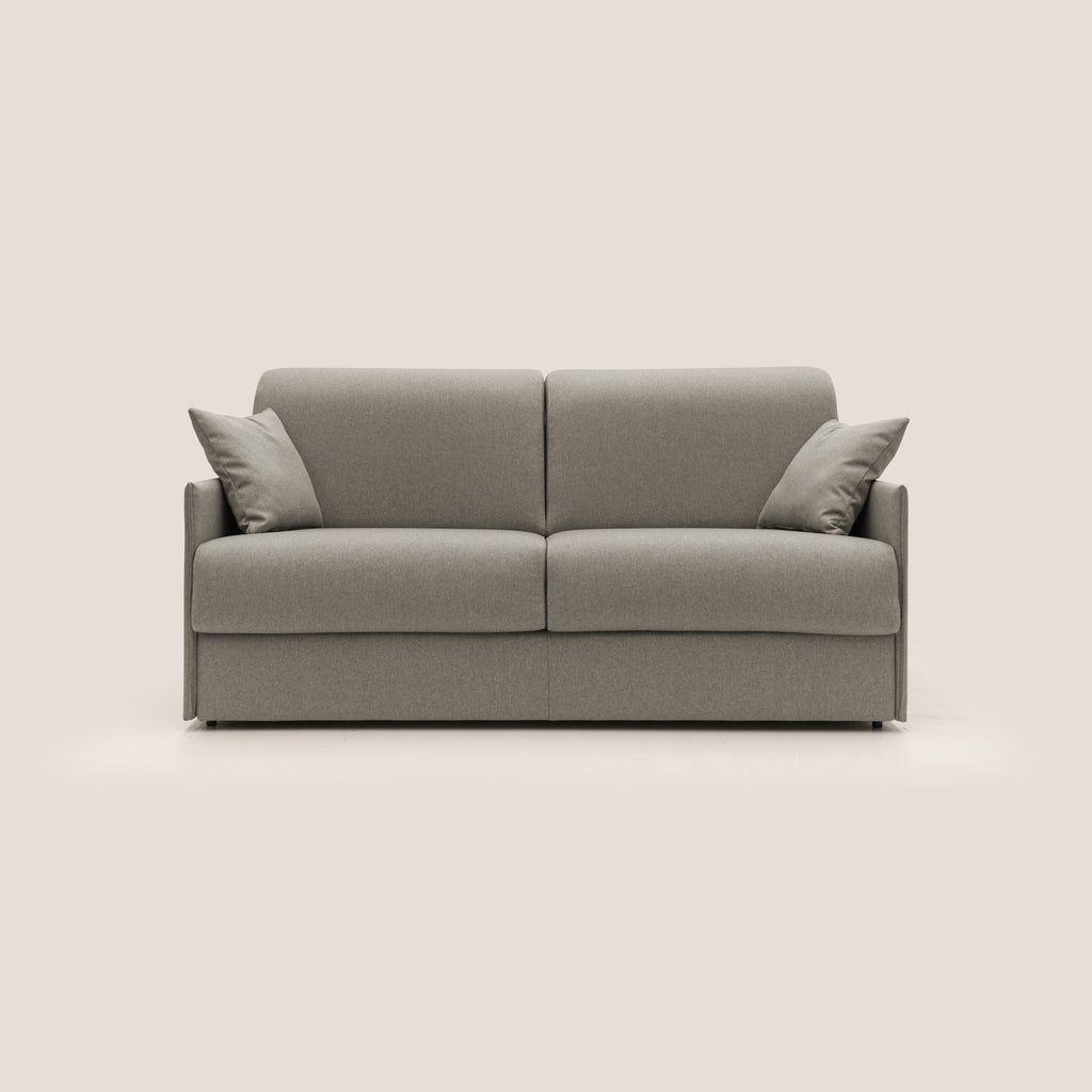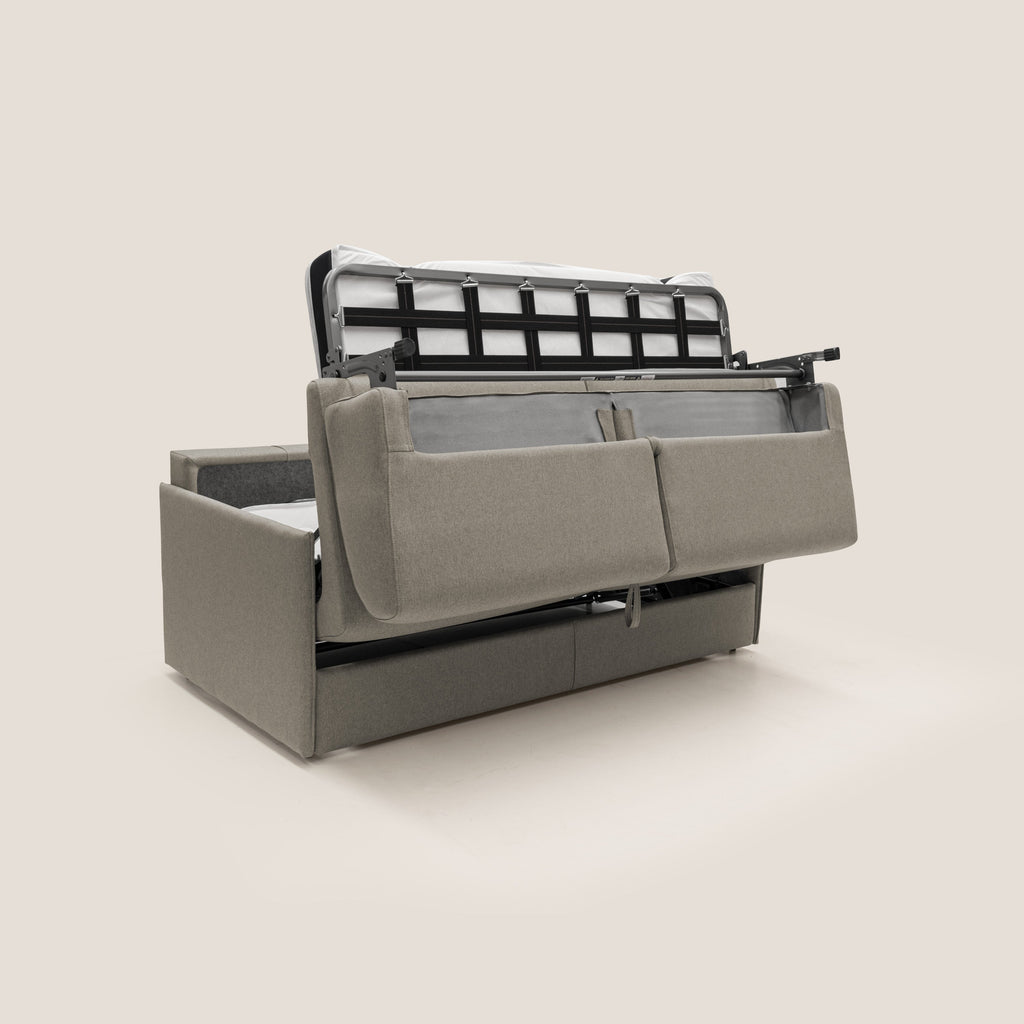 Il divano letto EVANS è una soluzione ideale per chi cerca comfort e funzionalità. Realizzato in tessuto impermeabile, è resistente alle macchie e facile da pulire. Dotato di un meccanismo di apertura e chiusura a ribalta semplice da utilizzare, è perfetto per piccoli spazi e per ospitare amici e familiari. Il suo design italiano di alta qualità lo rende resistente ed eterno nel tempo.