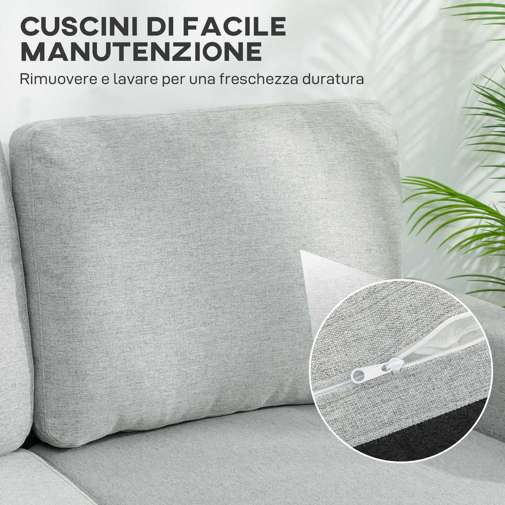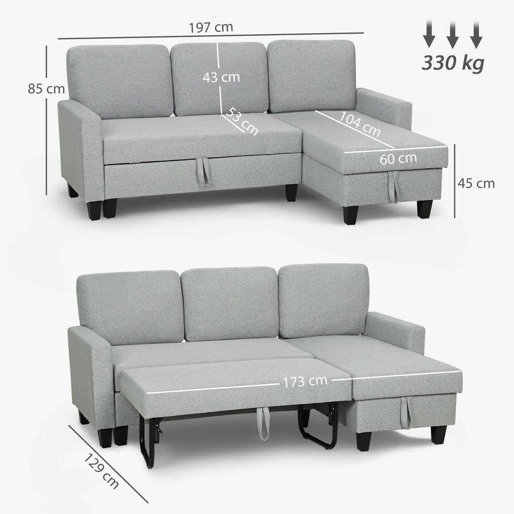 Divano Letto 3 Posti 197x129x85 cm con Chaise e Spazio Contenitore in Tessuto Effetto Lino Grigio e Nero
