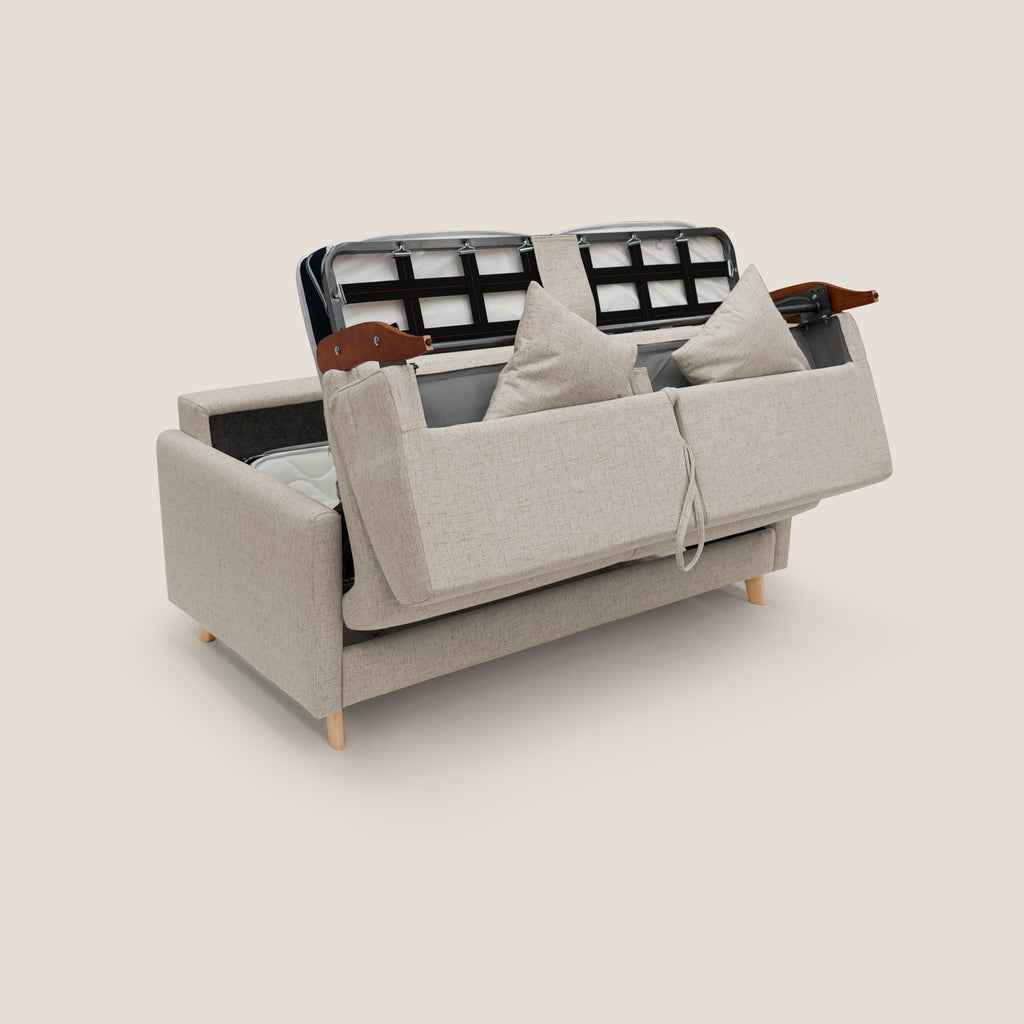 Il divano letto è disponibile in versione da 3 posti e da 2 posti, realizzato in tessuto impermeabile ed antimacchia. Grazie alle sue linee contemporanee e intramontabili, si adatta a qualsiasi spazio e design. Il divano è caratterizzato da un rivestimento lavabile anche a 30°, dotato di un vano porta cuscini nello schienale e piedini in legno naturale alti 13 cm. Questa soluzione offre un mix di leggerezza ed eleganza ed è ideale sia per ambienti contemporanei e moderni, che per spazi ispirati a una visione naturale o al design scandinavo.