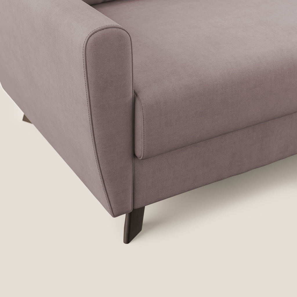 Il divano letto si distingue per le sue linee morbide e confortevoli, con uno schienale imbottito realizzato artigianalmente in Italia. Questo divano rappresenta una moderna interpretazione del classico divano capitonnè. I piedini in legno si adattano perfettamente a uno stile scandinavo e shabby. Il meccanismo a ribalta del divano include un piano di dormita a maglia elettrosaldata, ma può anche essere realizzato con un piano di dormita a doghe in faggio. Entrambe le opzioni hanno un terminale in cinghie elastiche che rende la seduta più morbida ed accogliente quando il divano è chiuso. Il tessuto del divano è morbido, impermeabile e antimacchia, il che facilita la pulizia. Inoltre, il trattamento idrorepellente permette di lavare il divano in lavatrice a 30° per una manutenzione veloce e accurata.