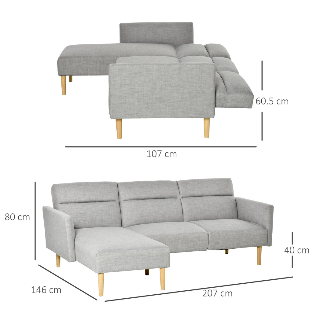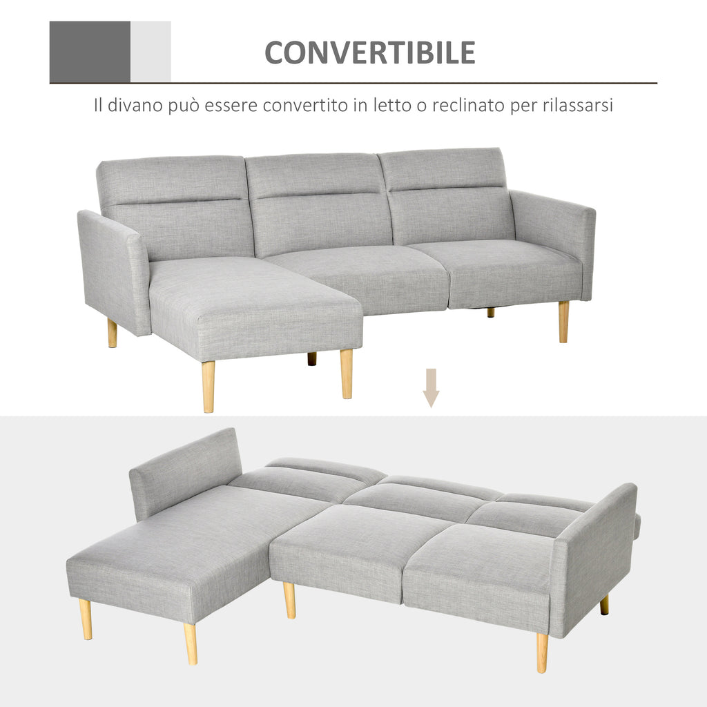 Divano Letto Angolare 207x107x60,5 cm con Penisola in Legno e Tessuto Grigio Chiaro