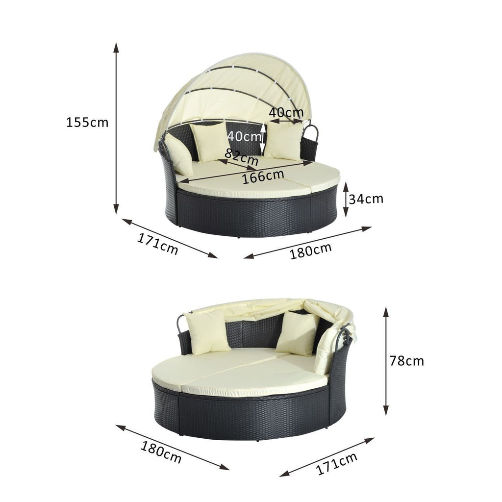 Divano Letto da Esterno Conchiglia con Poggiapiedi e Tenda Parasole in PE Rattan Nero