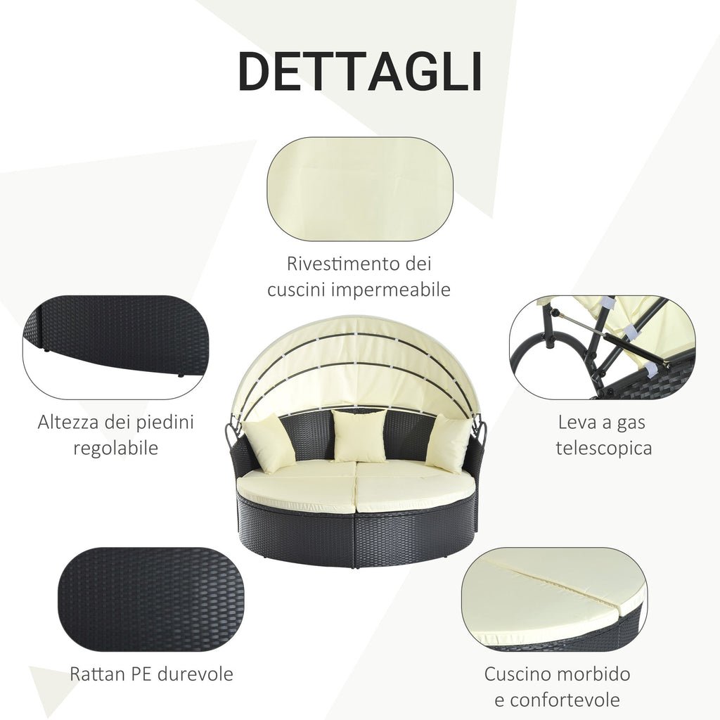 Divano Letto da Esterno Conchiglia con Poggiapiedi e Tenda Parasole in Rattan Sintetico Nero