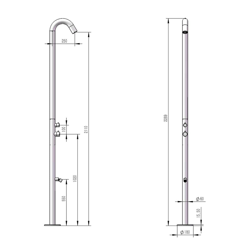 Doccia inox esterna per giardino alta qualita. la doccia inox è stata pensata e realizzata per qualsiasi installazione all'aperto. La doccia con doccino modello QUARTU è una doccia in Acciaio Satinato Aisi Inox 316 con ingresso acqua calda e fredda. La doccia per esterno è ottima per uso commerciale, privato, per piscina esterna-interna, giardino o per il bagno di casa. Altezza 2289 mm. diametro 60 mm.
