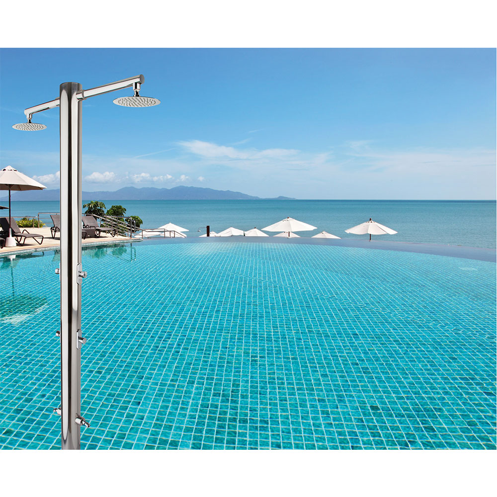 Doccia Esterna Doppia Tradizionale Nettuno con colonna e piedistallo realizzati in acciaio inox AISI 316L lucido e con soffioni in acciaio inox AISI 304 lucido.