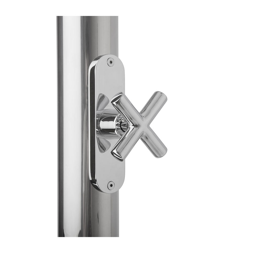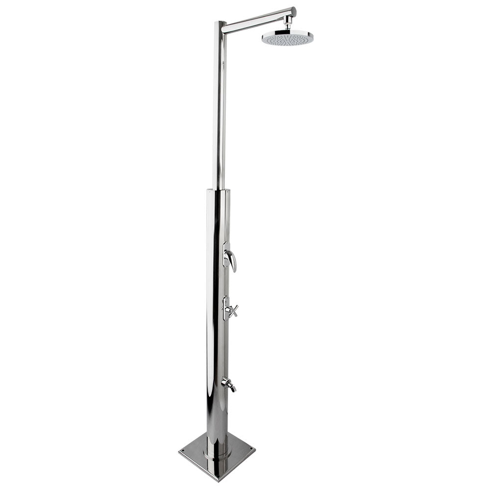 Doccia Esterna Tradizionale Plutone con colonna e piedistallo realizzati in acciaio inox AISI 316L lucido e con soffioni in acciaio inox AISI 304.