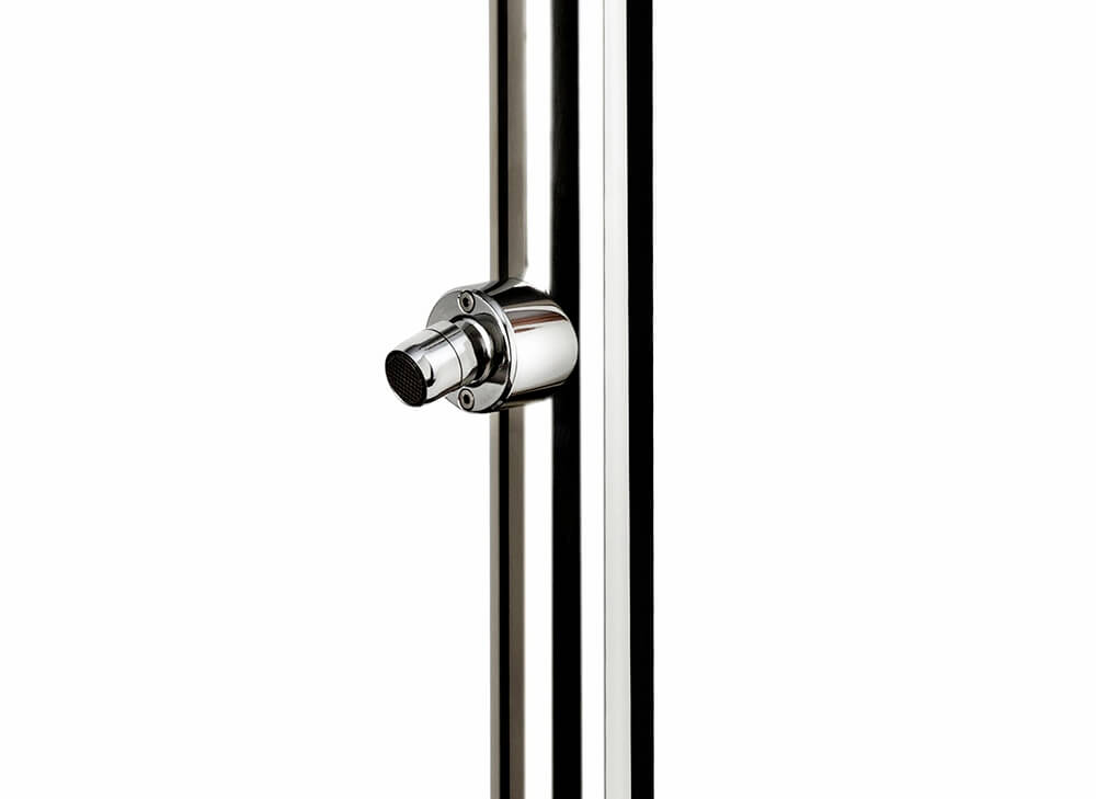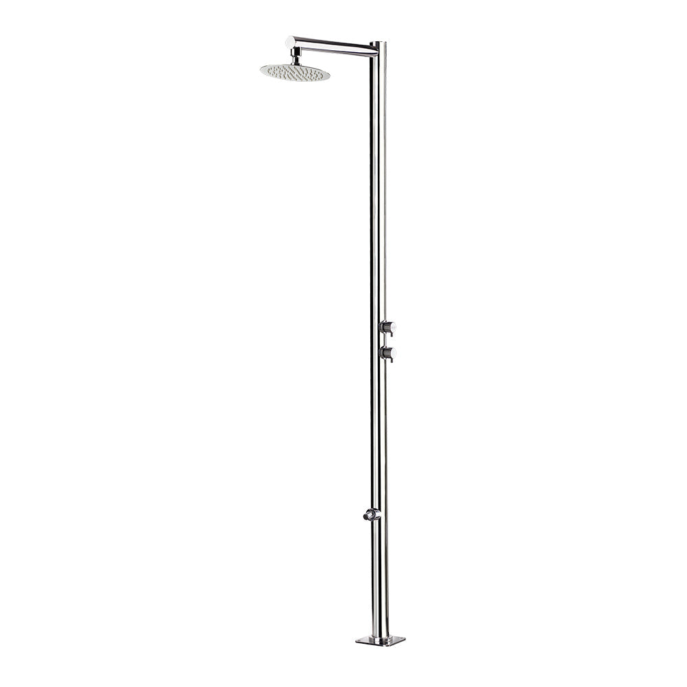 Doccia Esterna Tradizionale Venere con colonna e piedistallo realizzati in acciaio inox AISI 304 lucido e con soffione in acciaio inox AISI 304.