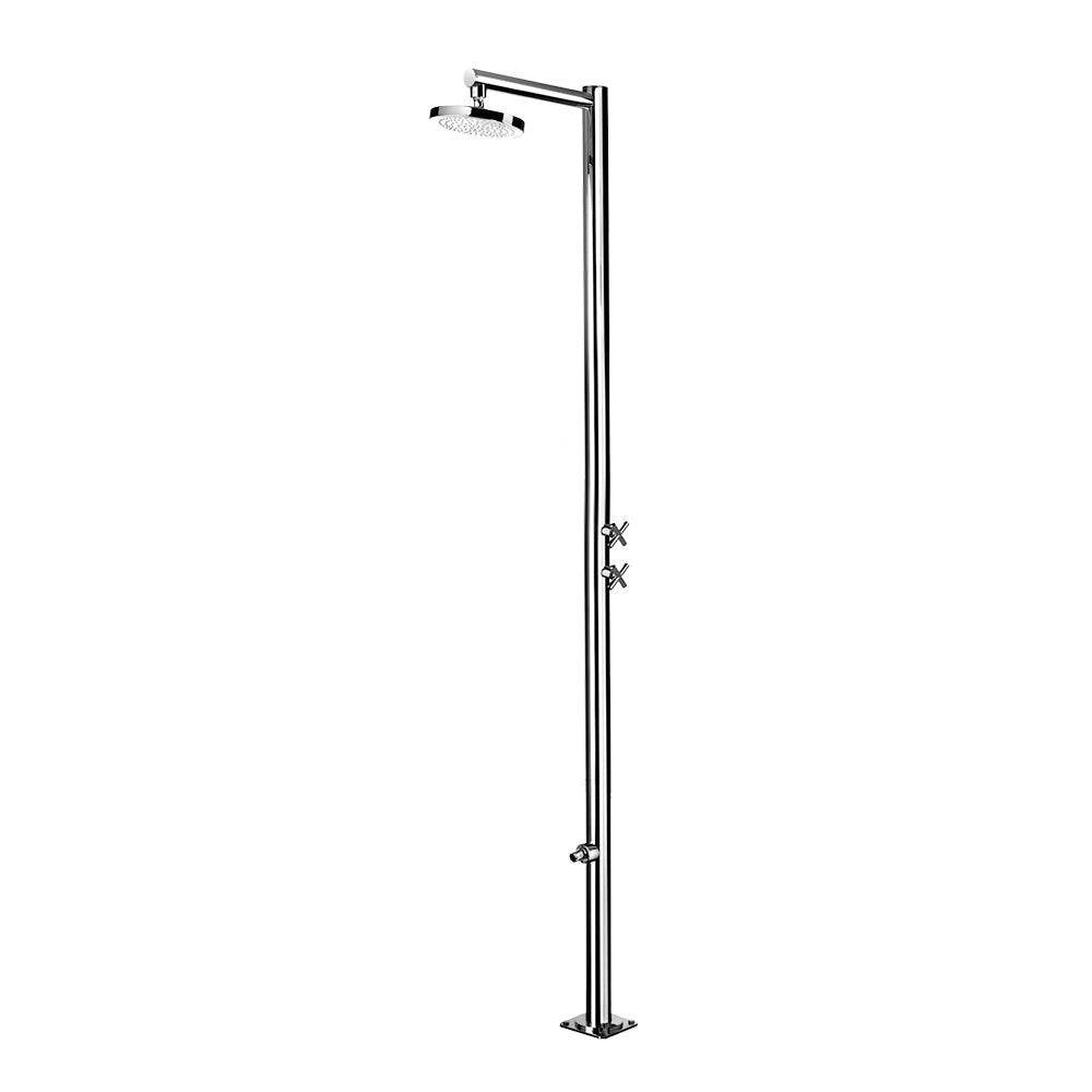Doccia Esterna Tradizionale Venere con colonna e piedistallo realizzati in acciaio inox AISI 304 lucido e con soffione in acciaio inox AISI 304.