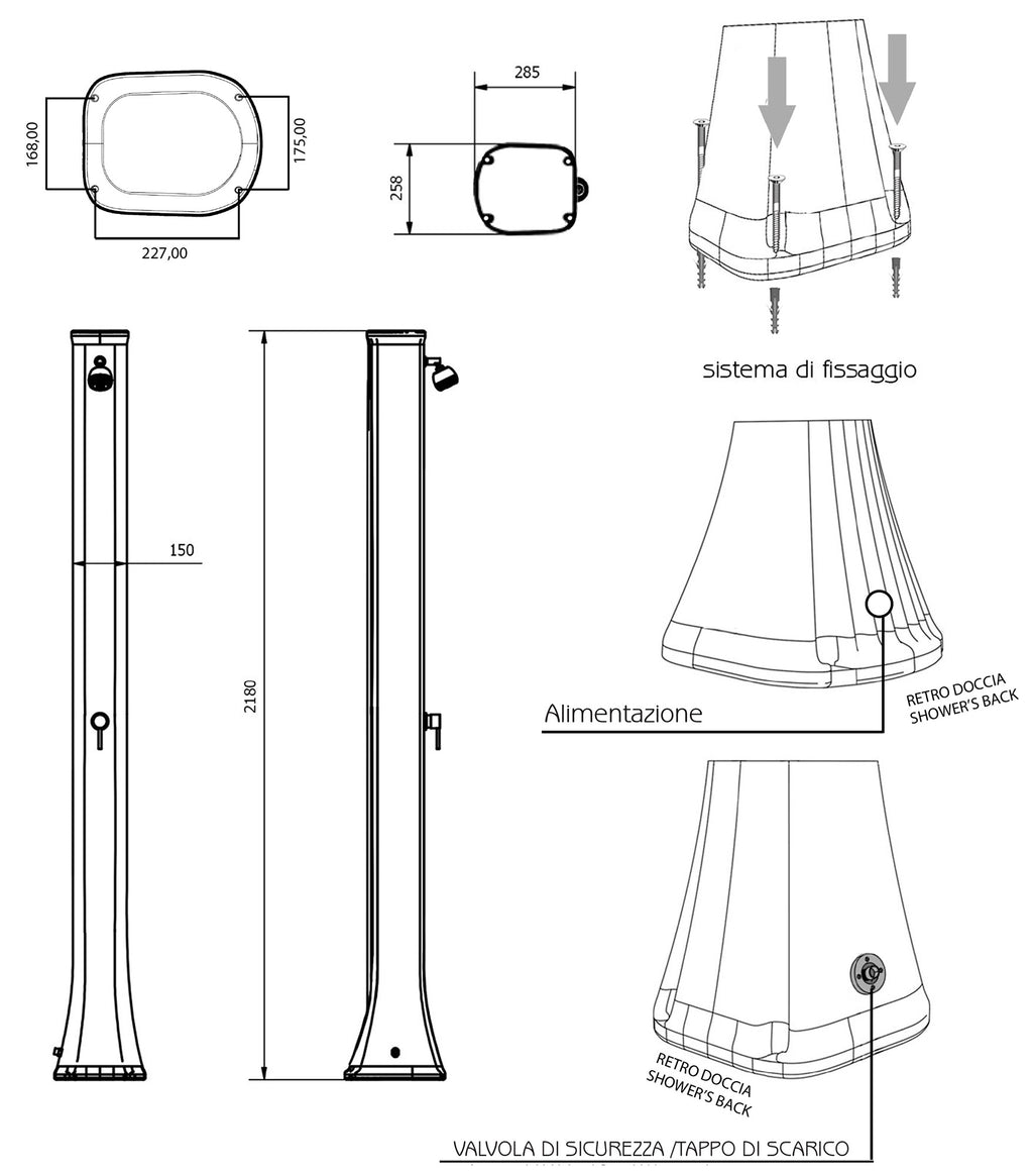 La doccia solare è progettata per essere utilizzata in condizioni di alimentazione idrica normale con una pressione inferiore a 3 bars (3 kg).