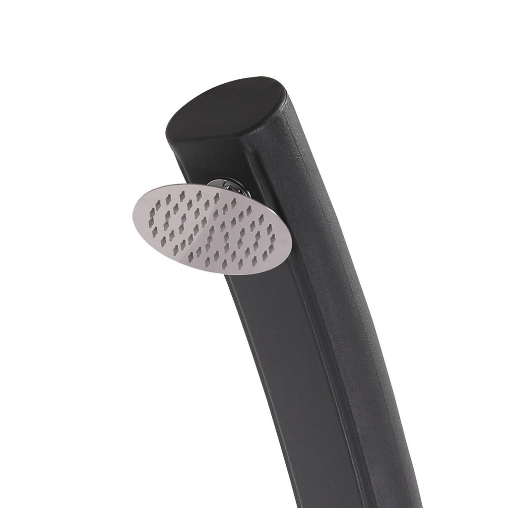 Design e componentistica esclusivi per questa doccia grigia a riscaldamento solare. realizzata in PEHD, polietilene ad alta densità molecolare atossico, molto resistente agli agenti atmosferici, raggi UV ed agenti chimici. Grande soffione con ugelli anticalcare appositamente progettati.