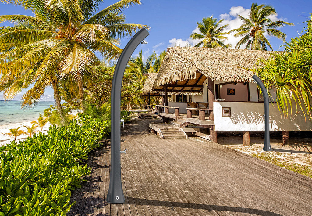 Doccia a riscaldamento solare da esterno dal design innovativo e originale, Happy Five con lavapiedi della ARKEMA.