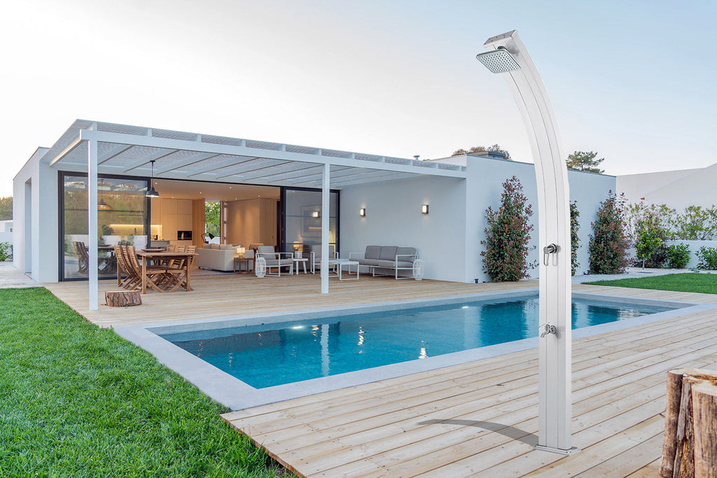 Il design contemporaneo di questa doccia solare si adatta perfettamente a qualsiasi giardino o terrazzo. Progettata interamente in alluminio e / o acciaio inossidabile. Il calore solare è sufficiente per riscaldare il suo grande serbatoio da 30 litri, quindi è ecologico al 100%. Il suo design curvo, la sua eleganza e la sua leggerezza rendono questa doccia indispensabile per tutti gli ambienti esterni. È sufficiente collegarla a una sorgente d'acqua.