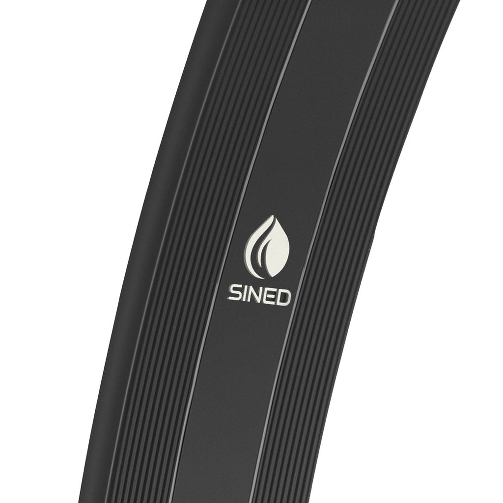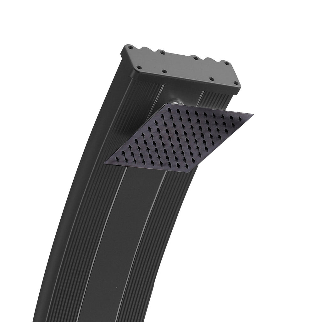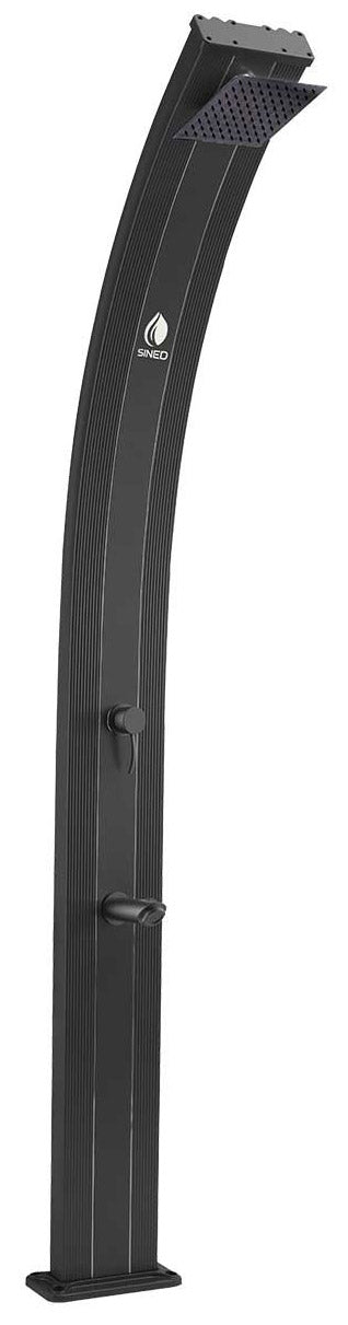 Doccia per esterni a riscaldamento solare Sined Lea colore nero Doccia con struttura Curva in Alluminio e capiente serbatoio da 30 Litri Doccia alta 225.4 cm dotata di grande Soffione quadrato Miscelatore e Rubinetto Lavapiedi.