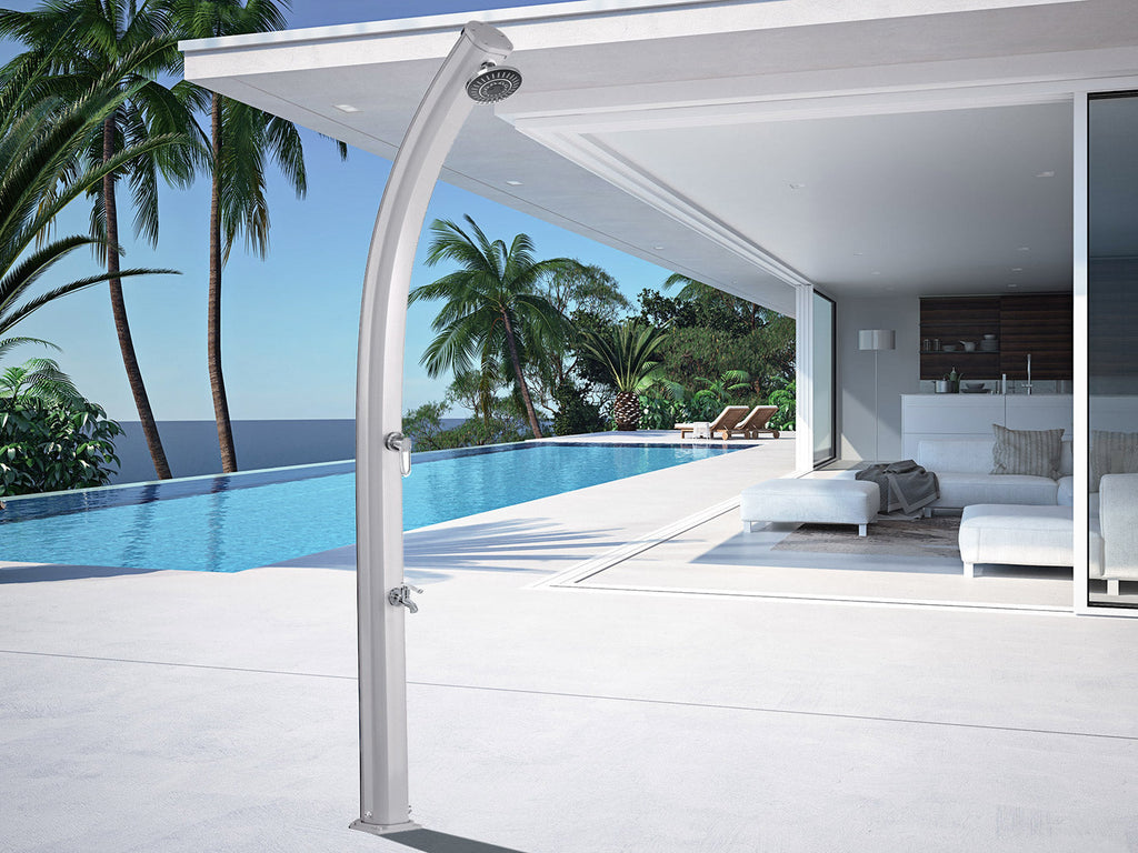 Sofisticata ed elegante, questa doccia solare si adatta perfettamente a tutti gli ambienti esterni. Realizzata in alluminio, è sufficiente solo l'azione del sole per riscaldare il serbatoio da 33 litri. Interamente ecologica ed è installabile facilmente a qualsiasi sorgente idrica.