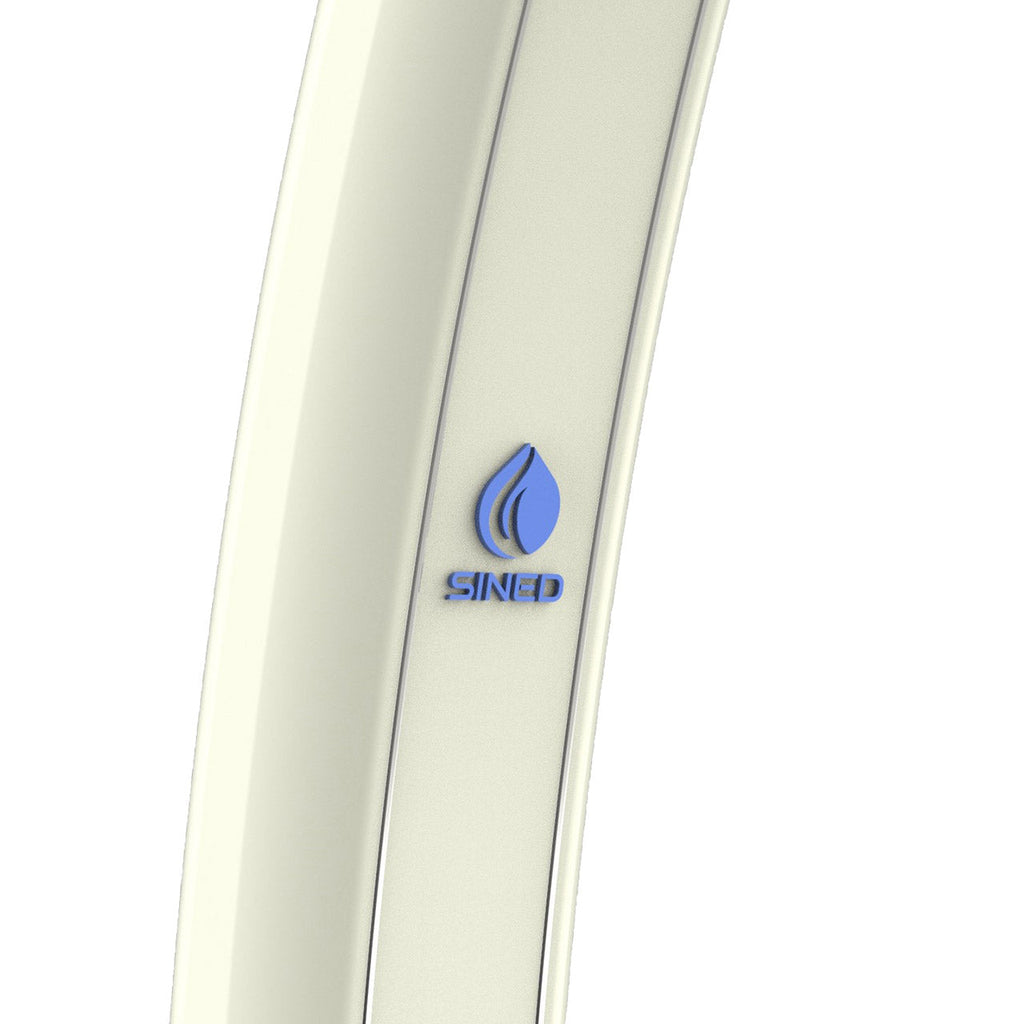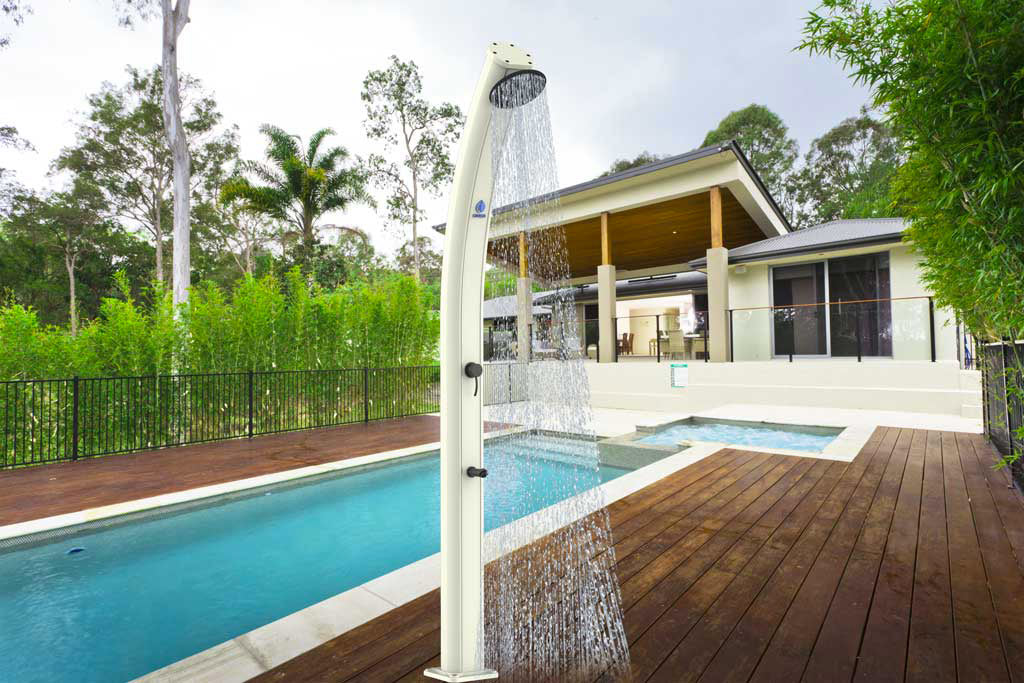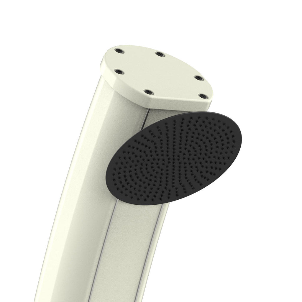 Doccia ecologica solare Sined DAFNE Bianca con Soffione rotondo da 20 cm Miscelatore e Rubinetto Lavapiedi Doccia con Struttura Curva in Alluminio per Esterno Serbatoio 35 Litri Altezza 226 cm. Indicata per bordo piscina, giardino, B&B, hotels e campeggi.