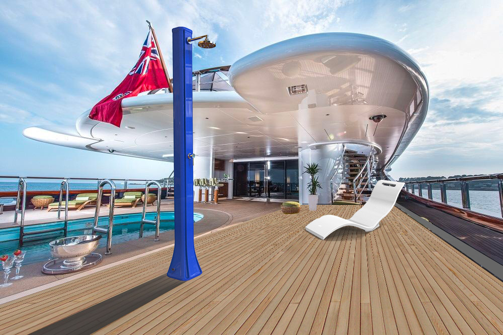 Doccia a riscaldamento solare da esterno dal design innovativo e originale, Big Happy Five con miscelatore della ARKEMA.