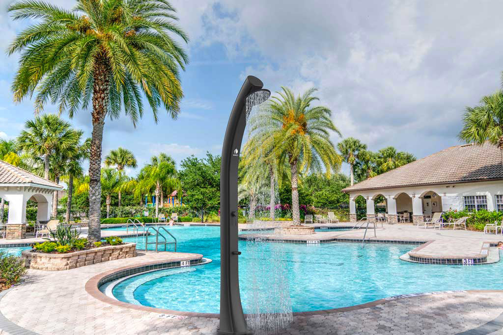 Doccia a riscaldamento solare Nera. Corpo curvo in Polietilene HD per Giardino e Piscina Altezza 226.6 cm. Dotata di Soffione rotondo diametro 20cm, Serbatoio 40 Litri e Rubinetto Lavapiedi. Accessori in ottone nero black matt. In regalo filtro anticalcare e copertura per la doccia.
