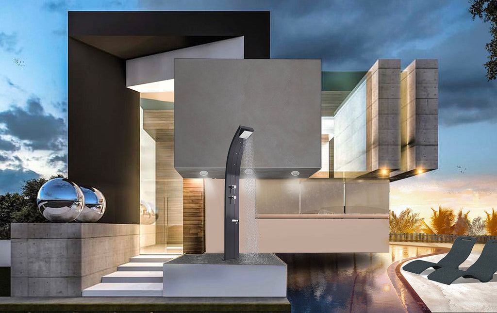Doccia Solare da esterno dal design innovativo e originale, Dada con nebulizzatore e lavapiedi della ARKEMA.