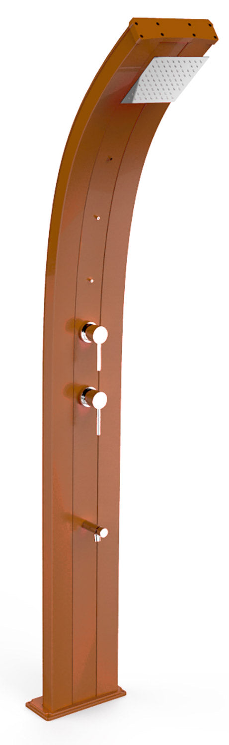 Miscelatore per scegliere la temperatura dell'acqua desiderata, sia per una rinfrescante doccia fresca sia per un tiepido getto d'acqua corroborante oppure una calda doccia all'imbrunire. Il circuito dell'acqua fredda è collegato in modo diretto all'impianto idrico, mentre il circuito dell'acqua calda è collegato al serbatoio riscaldato dai raggi solari e grazie al suo profilo posteriore frangivento offrirà massimo accumulo di energia solare
