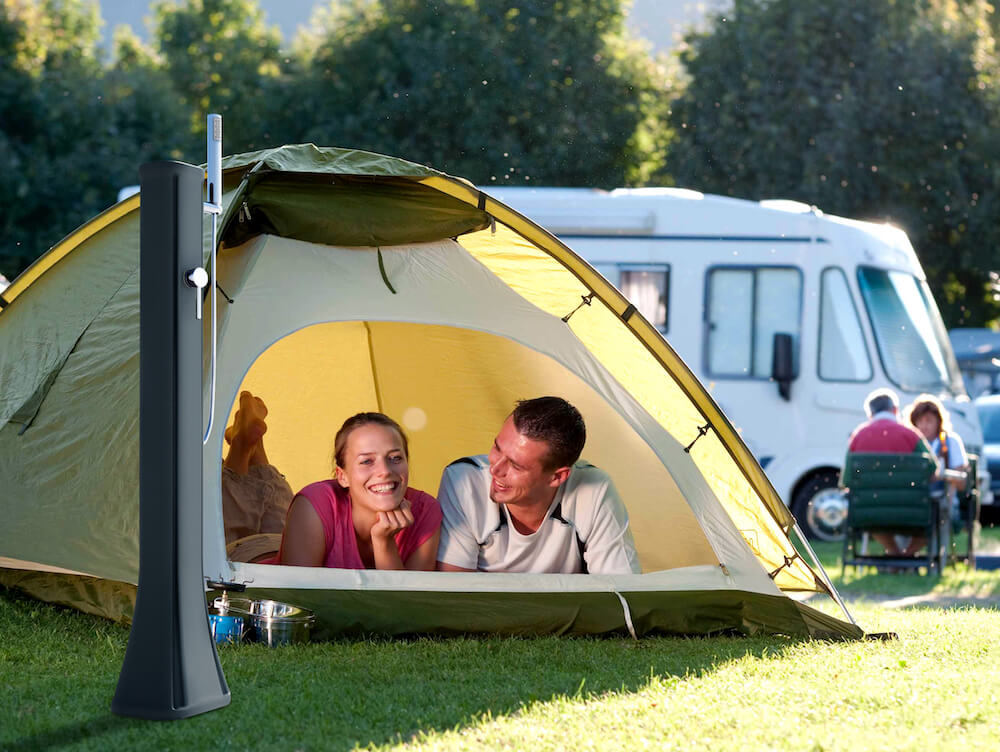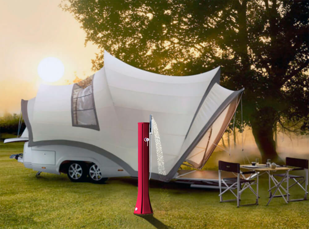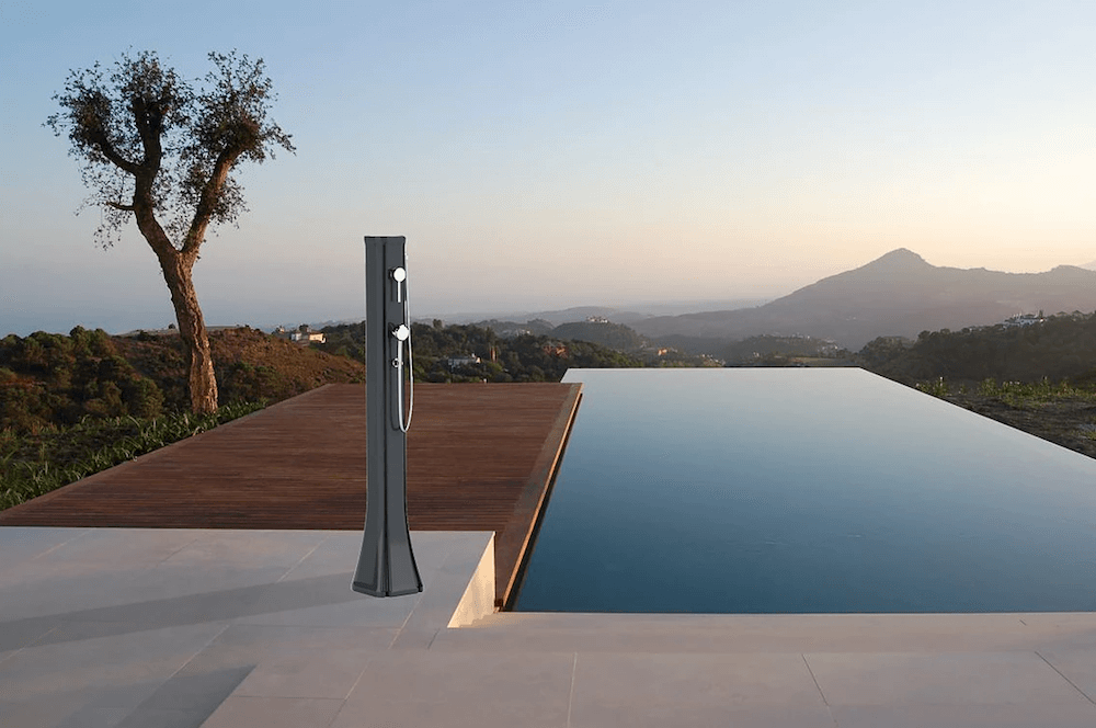 Doccia Solare da esterno dal design innovativo e originale, Happy Go con nebulizzatore e doccetta mobile della ARKEMA.