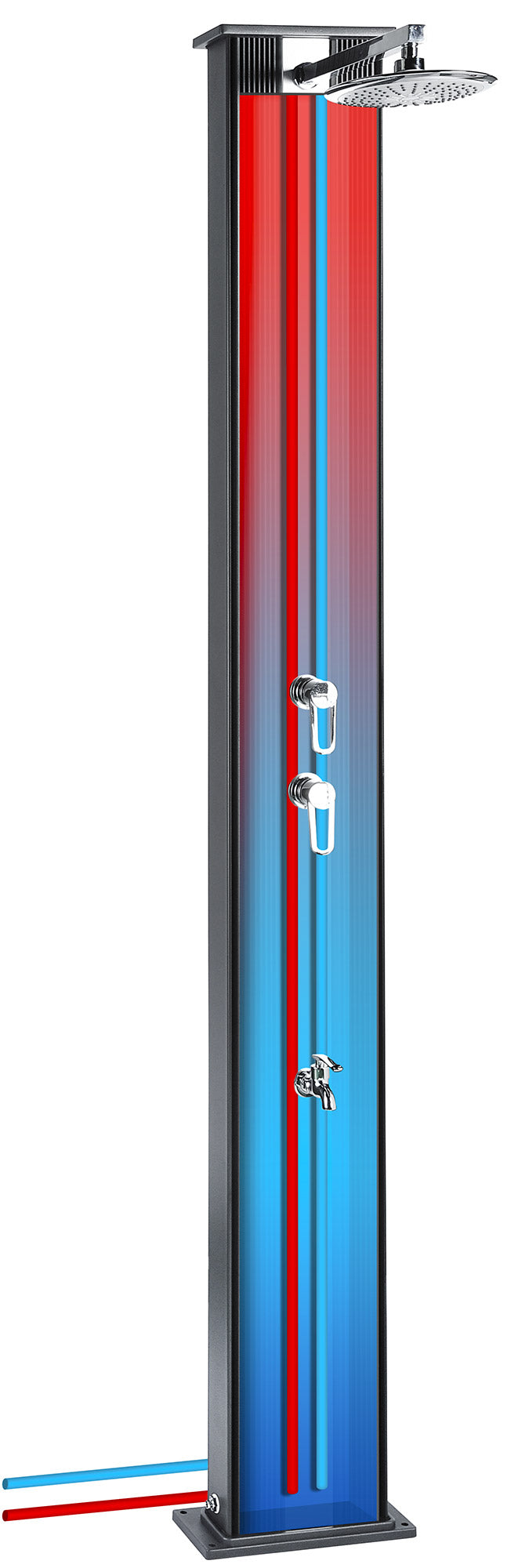 Questa Doccia combina la tecnologia solare ecologica ed è fornita di un serbatoio con una capienza di 37L, dotato di un attacco d'acqua calda, per garantire una doccia a temperatura controllata indipendentemente dal numero di utenti. Include un risciacquo piedi, Ideale vicino a una piscina. Inoltre è dotata anche di un attacco d'acqua calda per la rete domestica. In questo modo godi sia dell'acqua calda riscaldata al 100% dall'energia solare, ma in caso di necessità anche dell'acqua calda della tua rete idrica.