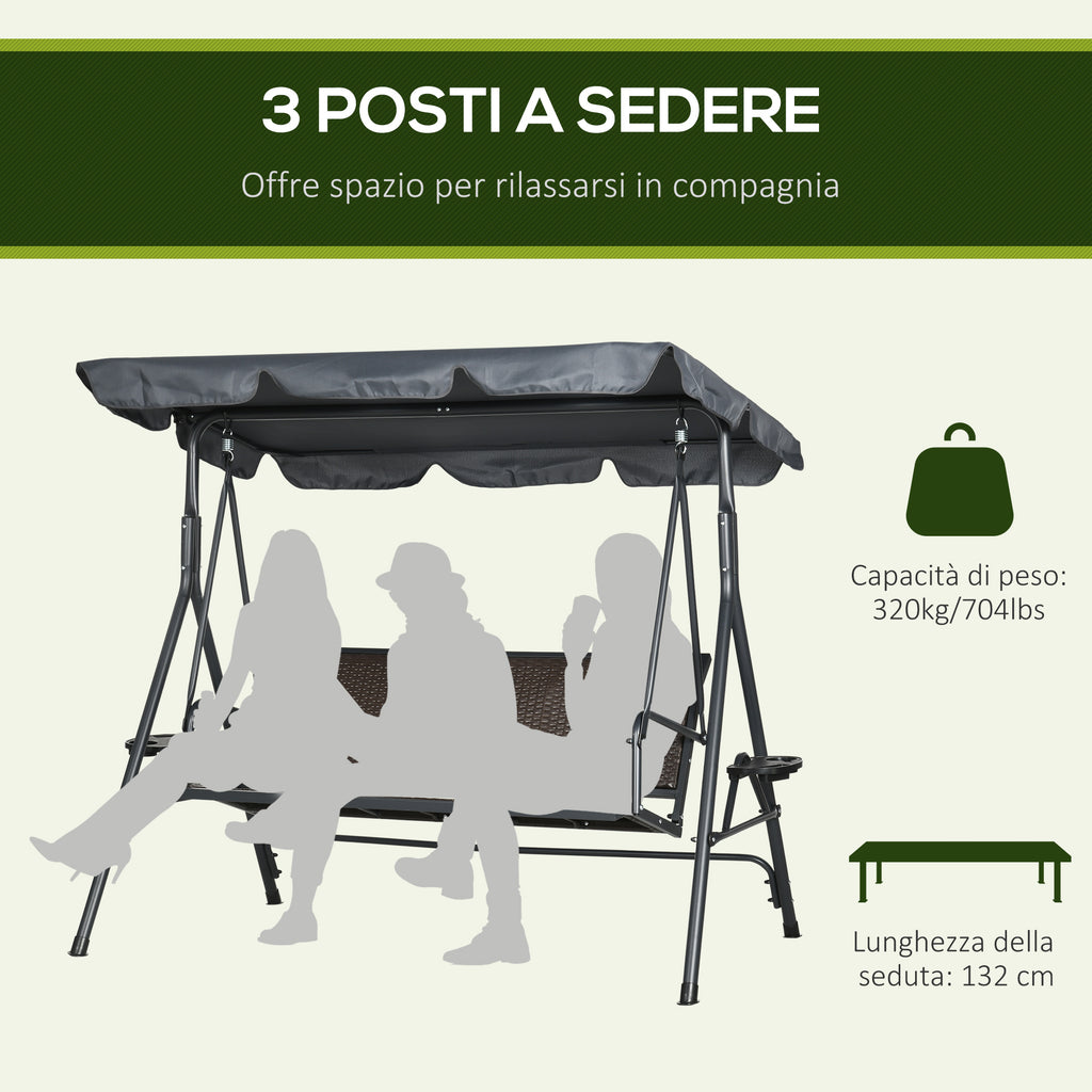 Il dondolo da giardino in rattan per 3 persone offre una fantastica comodità di seduta e di pulizia. Dotato di un tettuccio regolabile per una copertura d'ombra ottimale, il dondolo da esterno garantisce una protezione solare adeguata, oltre che un buon comfort e la giusta sicurezza. Trascorri il tuo tempo libero in compagnia utilizzando questo dondolo da 3 persone indipendente ed elegante per il tuo spazio esterno!