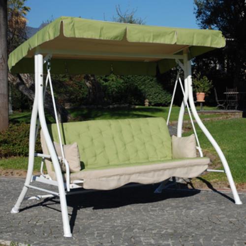 Dondolo 3 posti con schienale reclinabile in funzione letto, rivestimento seduta e tettuccio in poliestere., tubolare verniciato a polvere epossidica resistente agli agenti atmosferici e alla ruggine.